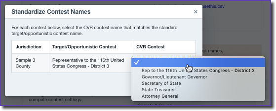 Note: For ballot comparison and hybrid audits, some contest names in the CVR files may not match the standardized contest names. To match contest names to the CVR files, simply click on Standardize Contest Names.