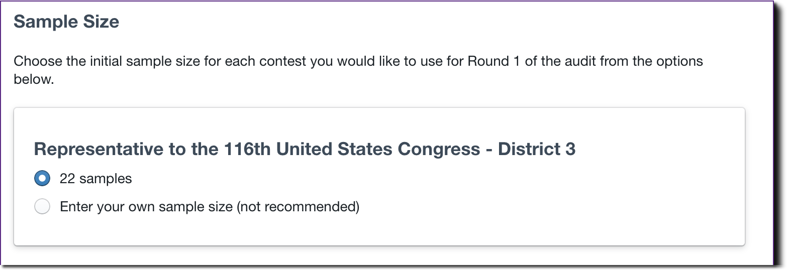 For ballot polling audits, the BRAVO (Ballot-polling Risk-limiting Audits to Verify Outcome) sample size is the most efficient number of ballots the RLA math thinks is necessary to complete the audit. Some jurisdictions choose to use that sample size knowing there is a higher possibility of needing to do an additional round of sampling to attain the risk limit. Arlo provides options, allowing you to pick a larger sample size for the first round to create a smaller possibility of retrieving ballots in a second round.