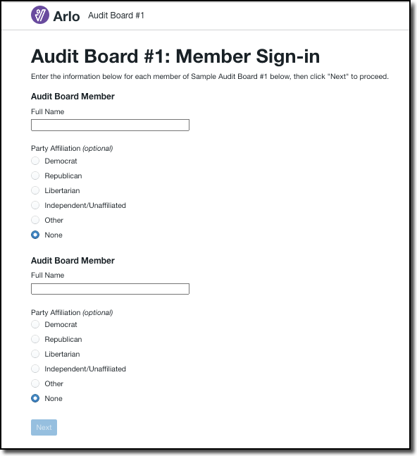 Enter audit board member information. We recommend two people complete this task to ensure accurate data entry. Complete Party Affiliation information as required by your state.