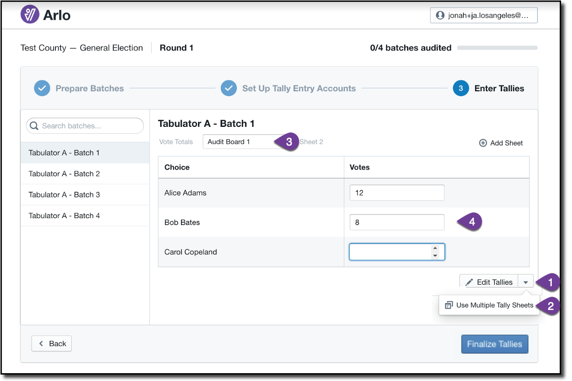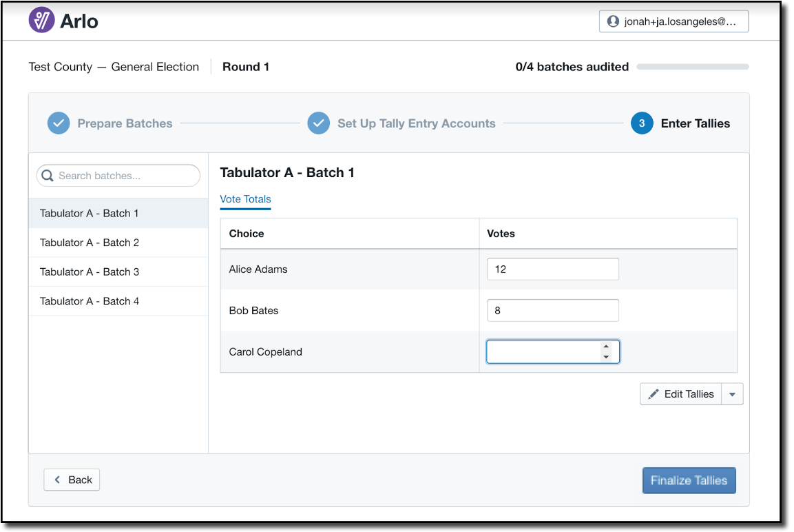 The tallies for each batch selected for audit must be entered into Arlo to conclude the audit. Tallies can be entered by audit boards, specified tally entry users, and/or jurisdiction managers.