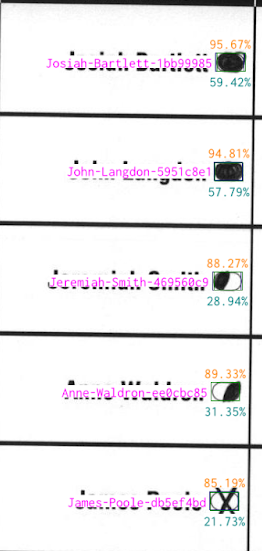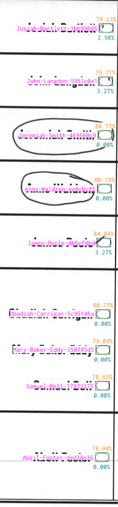 Marks are determined valid and counted by the system if the amount of darker pixels in the bubble area exceeds a configurable threshold. This threshold can be adjusted to have a stricter or looser interpretation of what is considered a valid mark. The recommended and default threshold in the system is 7%, under which marks such as a light dot, a fold through a bubble, a stray mark outside of the bubble, or a small line just on the corner of a bubble will be considered invalid. Marks such as a completely filled bubble, half filled bubble, or an X in a bubble will be considered valid. Examples of invalid and valid marks along with the score for that mark (in green) are shown below.