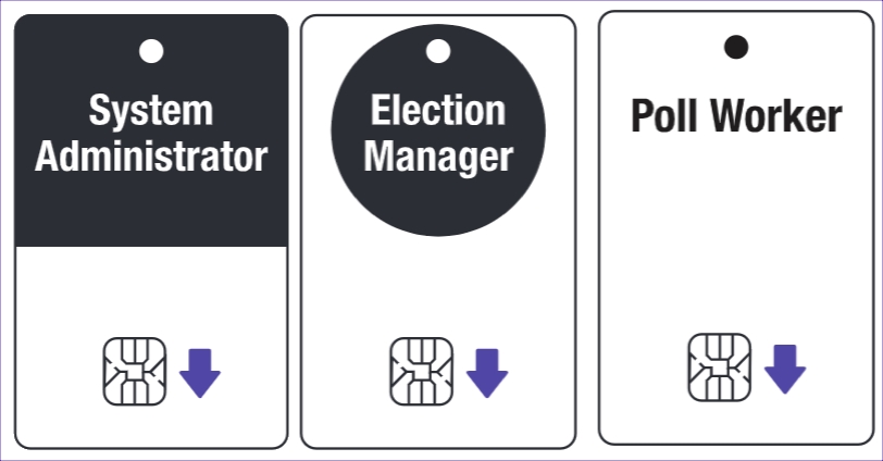 Smartcards are used to configure and operate equipment. It's the same technology as the chip in your credit card, but is instead used to provide election administrators and poll workers a secure means to configure and operate the equipment. There are three user roles and cards: System Administrator, Election Manager, and Poll Worker.