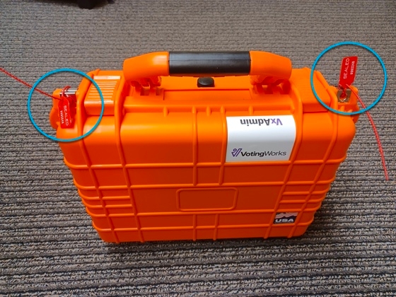 VxAdmin is a commercial off-the-shelf (COTS) laptop pre-installed with VotingWorks software and an optional printer. All USB drives, cords, adapters, and programmable smartcards needed to operate the system are included and stored in an orange case.