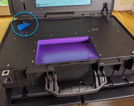 The interior panel should remain sealed and secure at all times unless a poll worker requires access. Any unauthorized access should be reported to an election administrator immediately.
