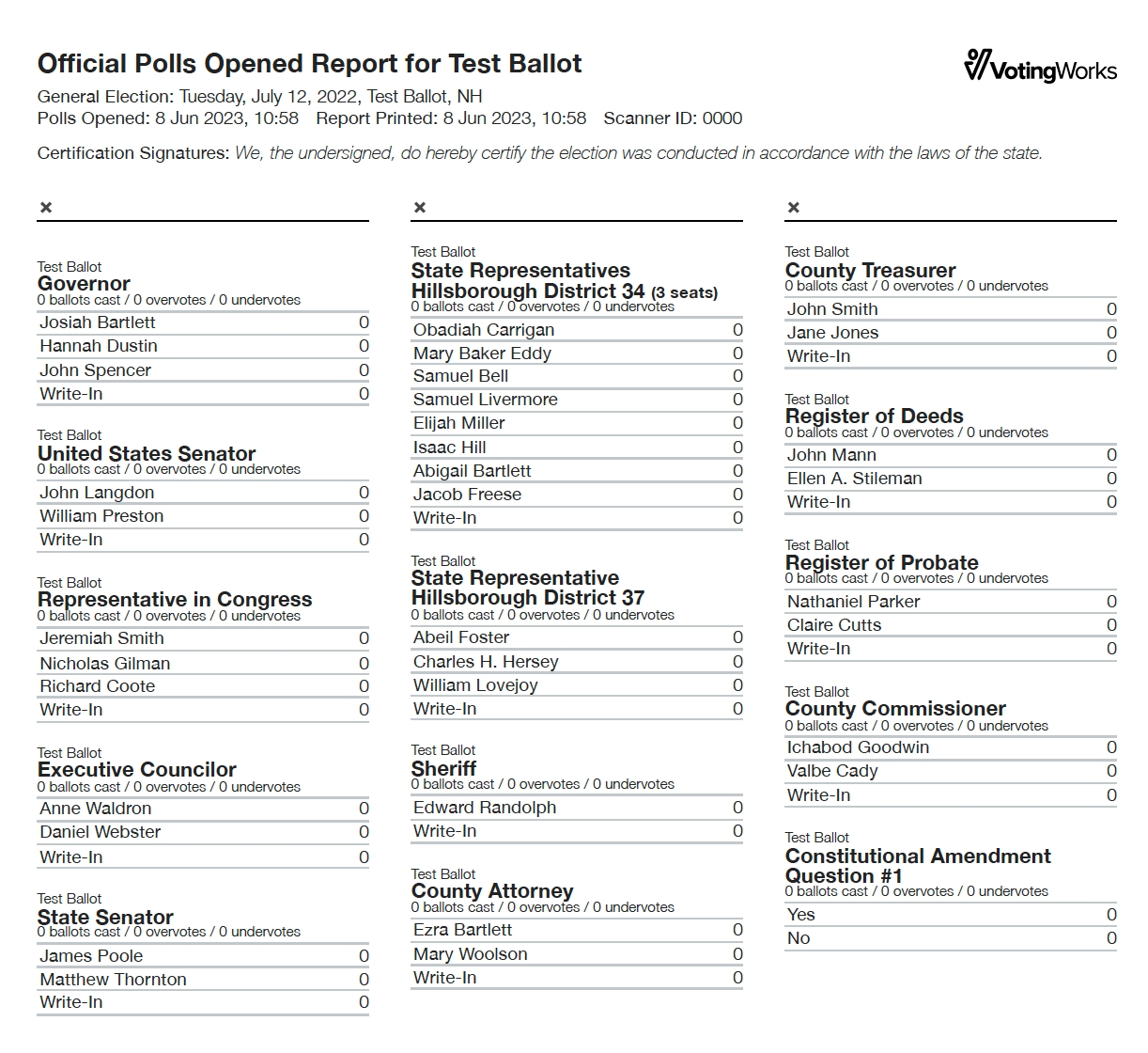 Below is an example of the Polls Opened Report. All contest totals should be zero when polls are opened.