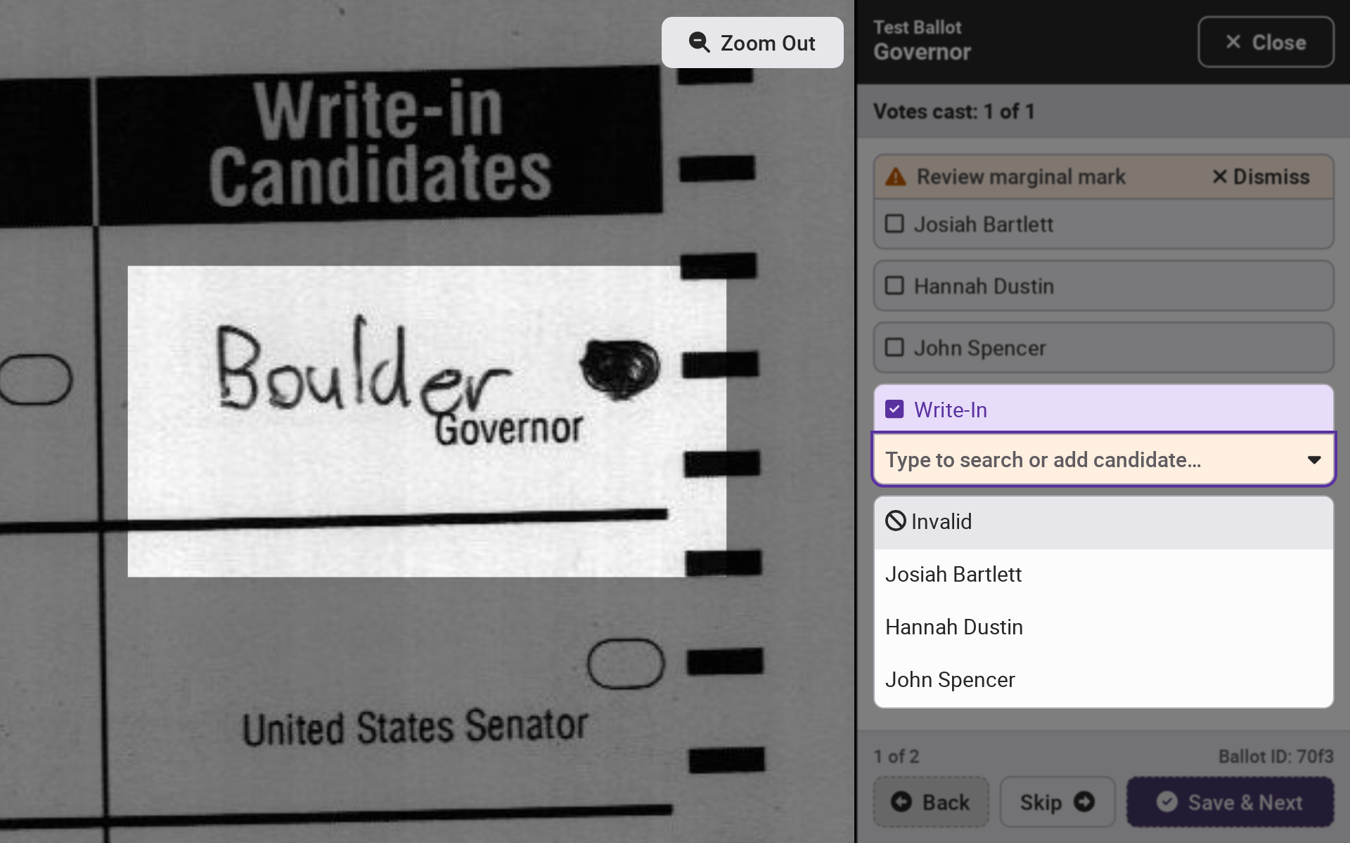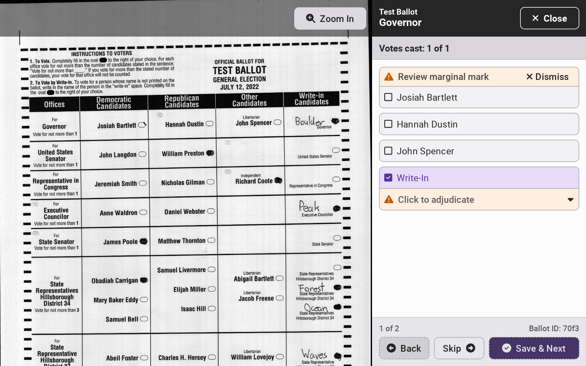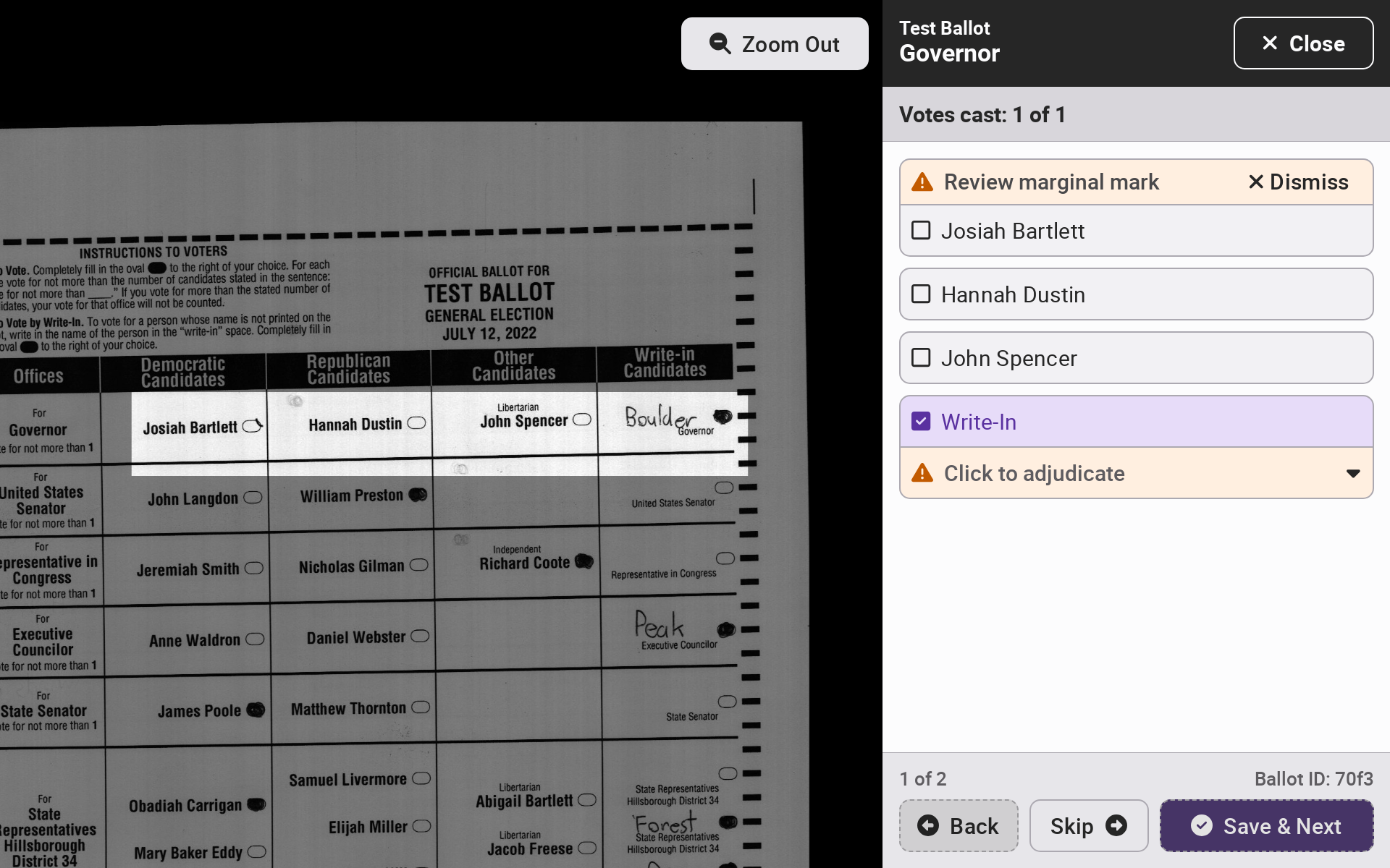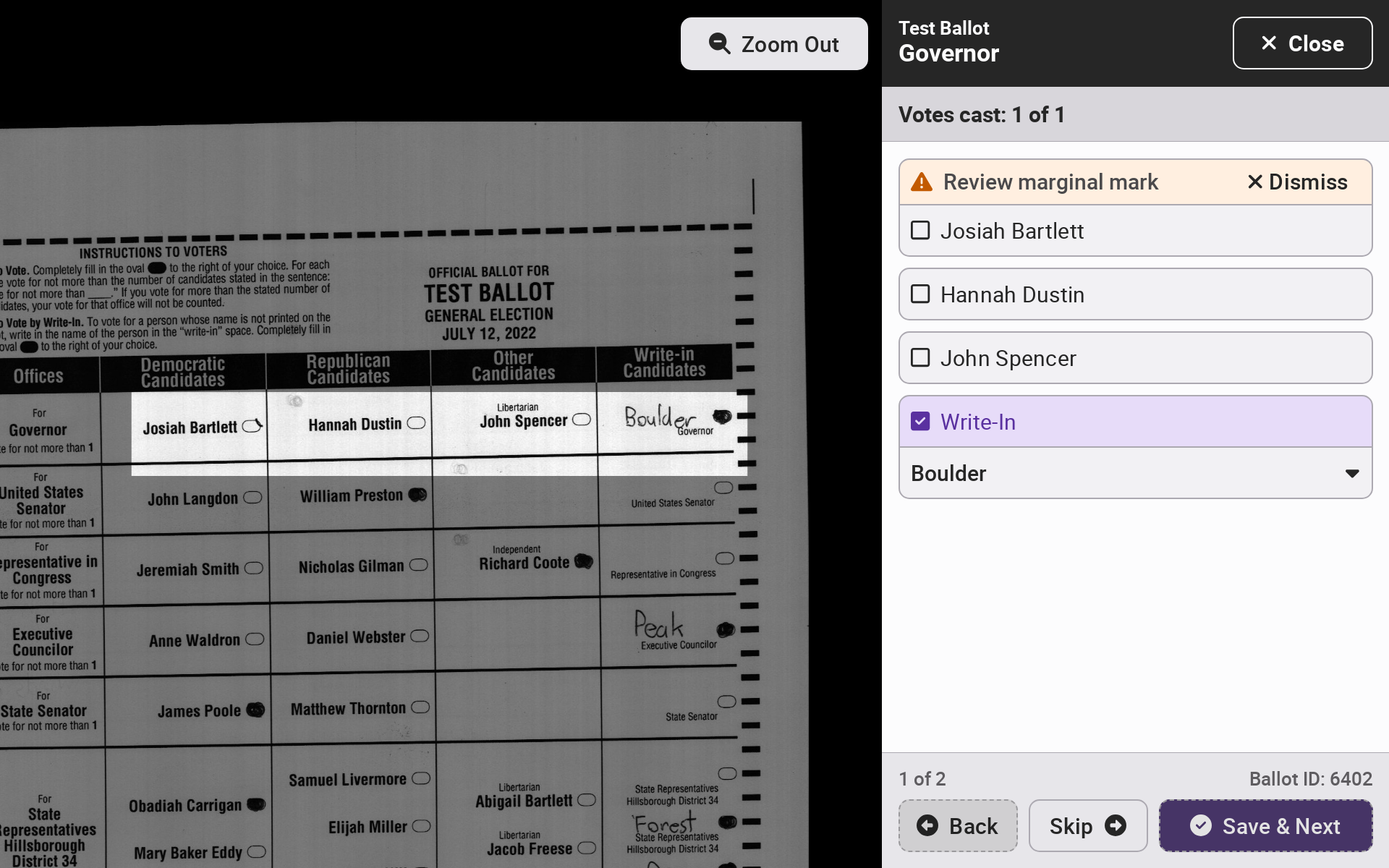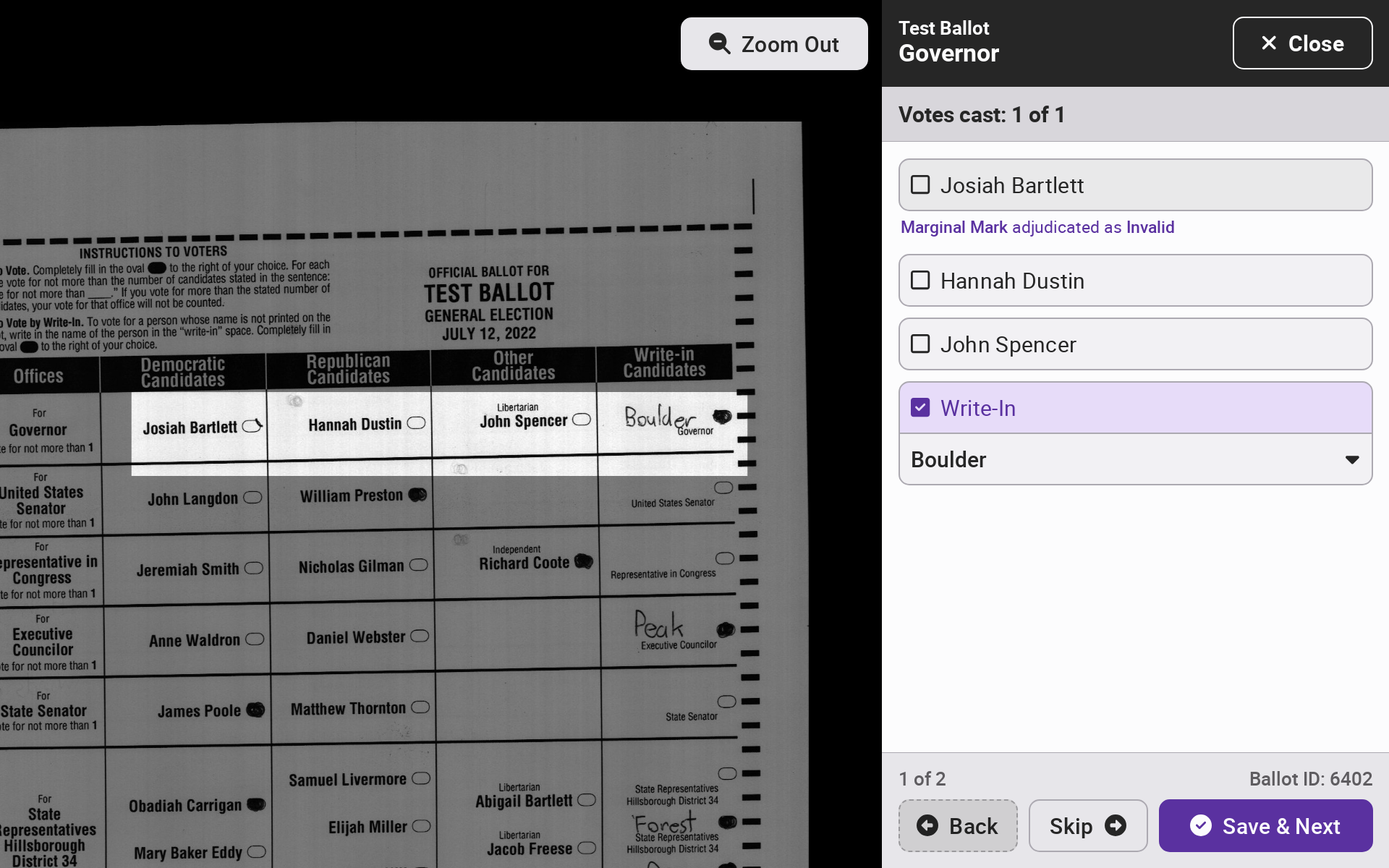 For every ballot requiring adjudication, the contest area will be highlighted. Select *`Zoom Out`* to see the entire ballot. Select *`Back`*, *`Skip`*, or *`Save & Next`* to navigate across ballots.