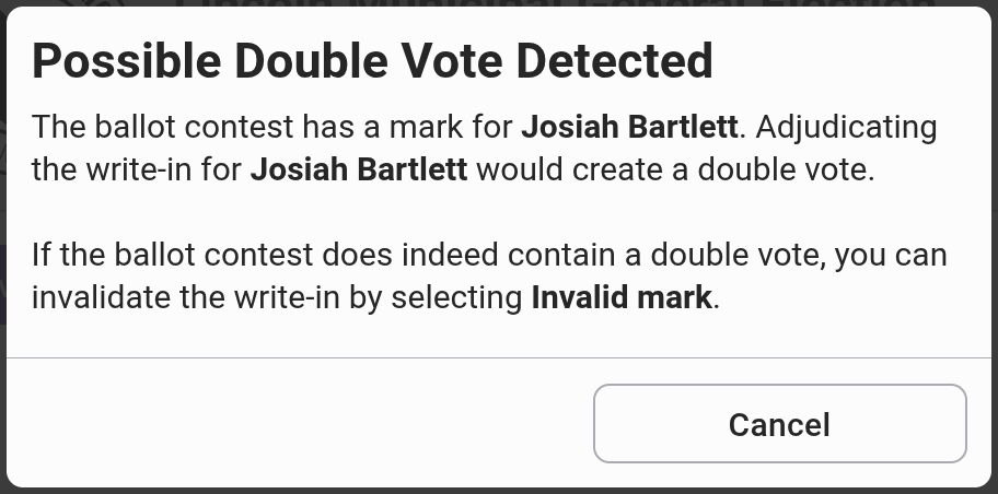 If a write-in is for an official candidate and the system also detects a mark for the official candidate, the following message will appear to prevent double votes:
