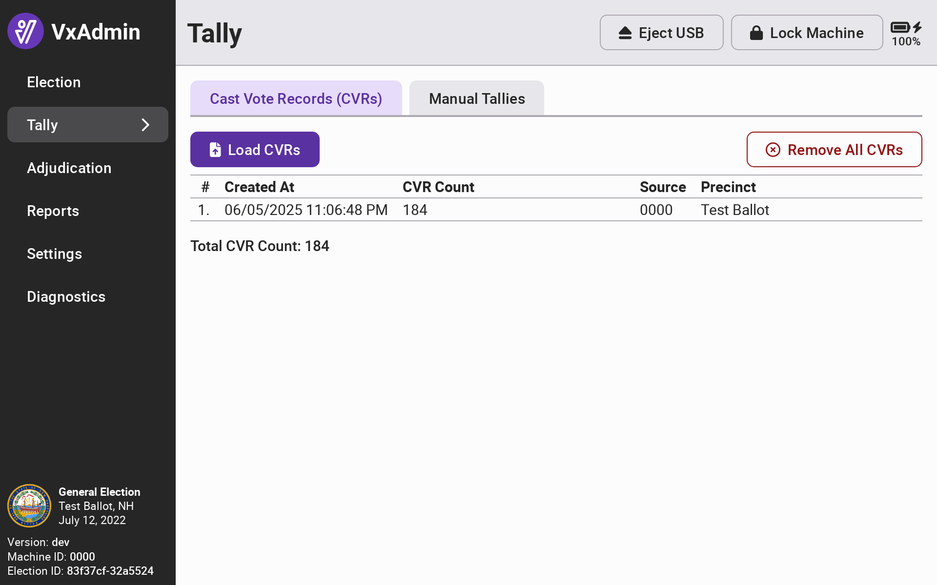 <figure><img src="https://2752676040-files.gitbook.io/~/files/v0/b/gitbook-x-prod.appspot.com/o/spaces%2FJtZutzGTdCzsGITrdiph%2Fuploads%2Fgit-blob-515e3b0740ba4c6b4fcc8eec8a38d500b0f65cdc%2Fvxadmin-tally-screen-with-cvrs.png?alt=media" alt="" width="375"><figcaption></figcaption></figure>