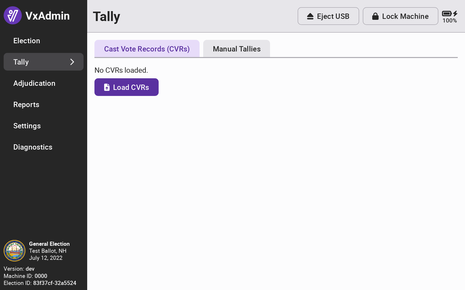 Navigate to the Tally screen by selecting *`Tally`* from the side menu. Select *`Load CVRs`* to load the cast vote records.