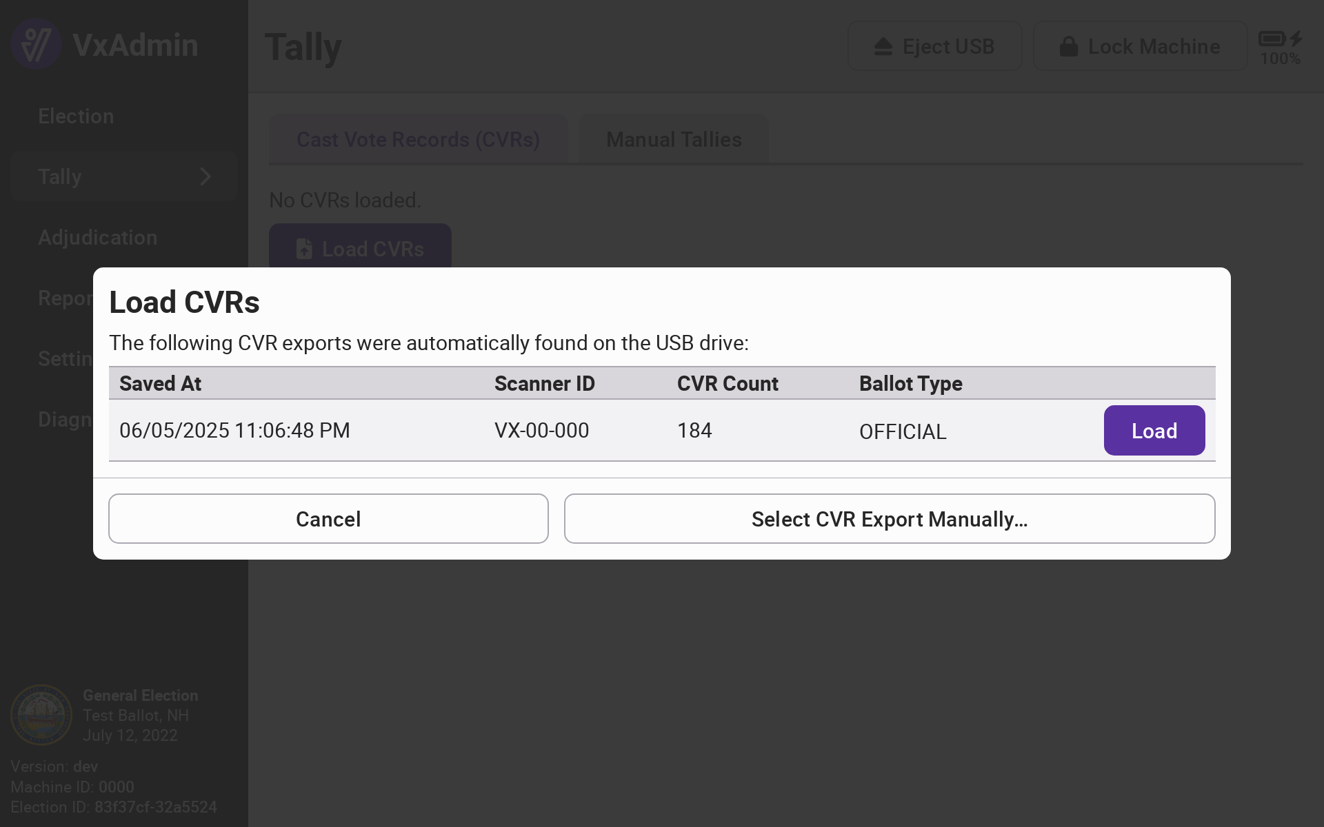 <div><figure><img src="https://2752676040-files.gitbook.io/~/files/v0/b/gitbook-x-prod.appspot.com/o/spaces%2FJtZutzGTdCzsGITrdiph%2Fuploads%2Fgit-blob-5ca050316d0c741783fcff71b55c539b664c023a%2Fvxadmin-tally-screen-empty.png?alt=media" alt=""><figcaption></figcaption></figure> <figure><img src="https://2752676040-files.gitbook.io/~/files/v0/b/gitbook-x-prod.appspot.com/o/spaces%2FJtZutzGTdCzsGITrdiph%2Fuploads%2Fgit-blob-a04428d046e4ad0b99ac81434fff66f389ac812e%2Fvxadmin-load-cvrs.png?alt=media" alt=""><figcaption></figcaption></figure></div>