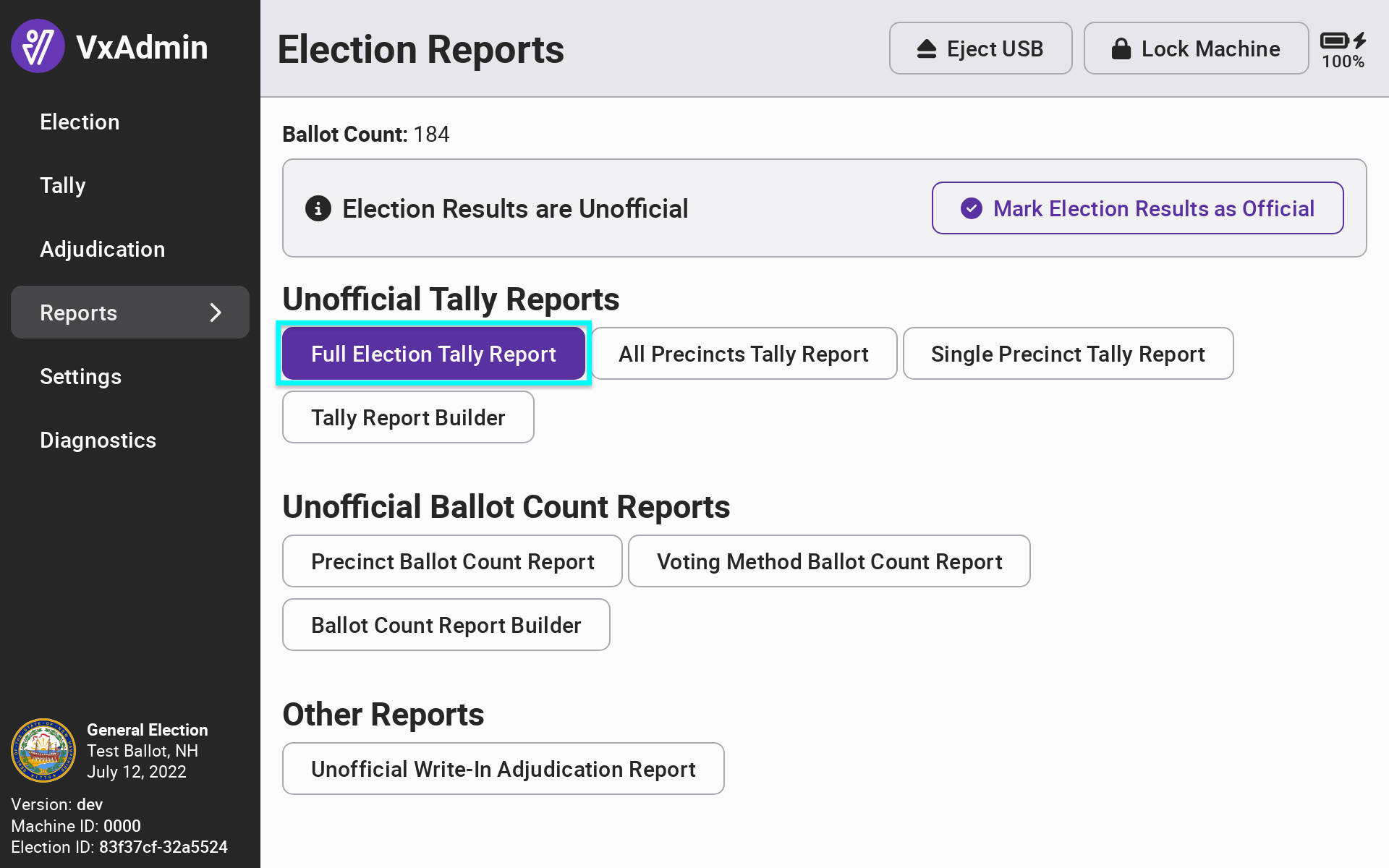 Before starting the testing process, using an election manager card, confirm VxAdmin does not have CVRs loaded. Select Reports from the side menu and select Full Election Tally Report to print a "zero" report.