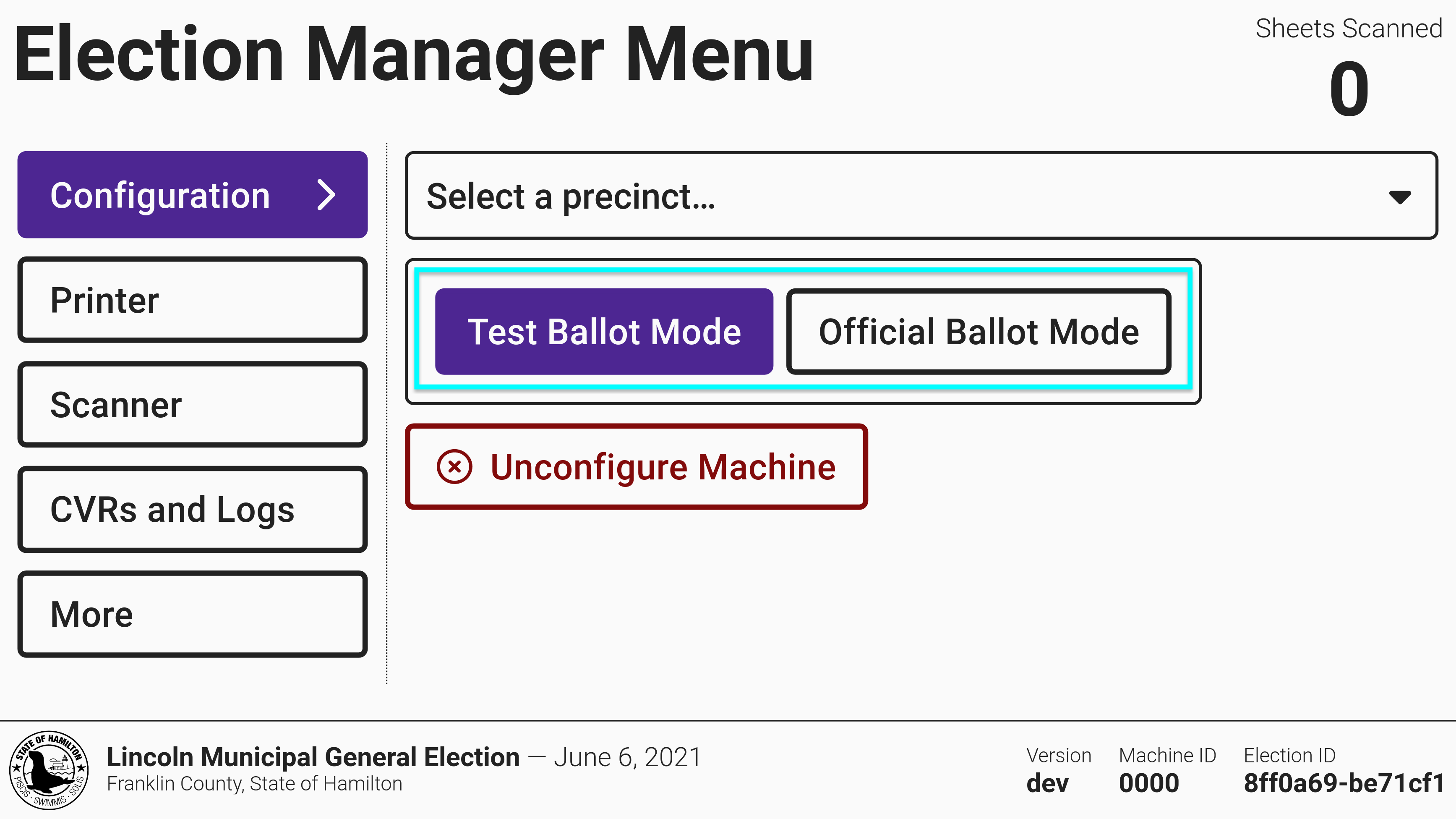 You may scan official ballots in test mode if your election package has the system setting allowOfficialBallotsInTestMode enabled. This setting is used for jurisdictions that only print official ballots.
