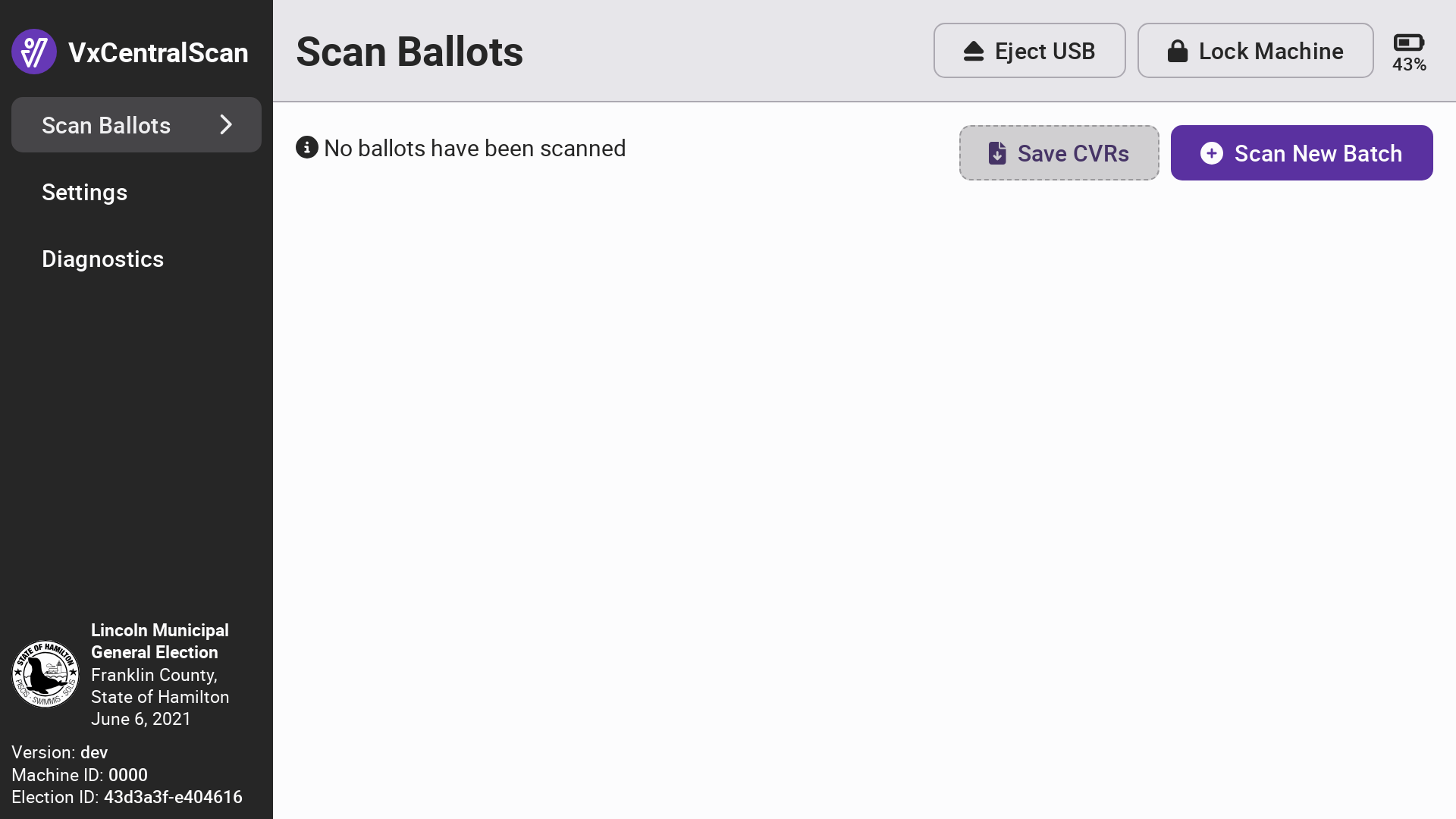 VxCentralScan is now configured and in test mode. The screen will show *No ballots have been scanned* and election summary information (name, date, jurisdiction, etc.) will be shown in the bottom left corner of the screen.
