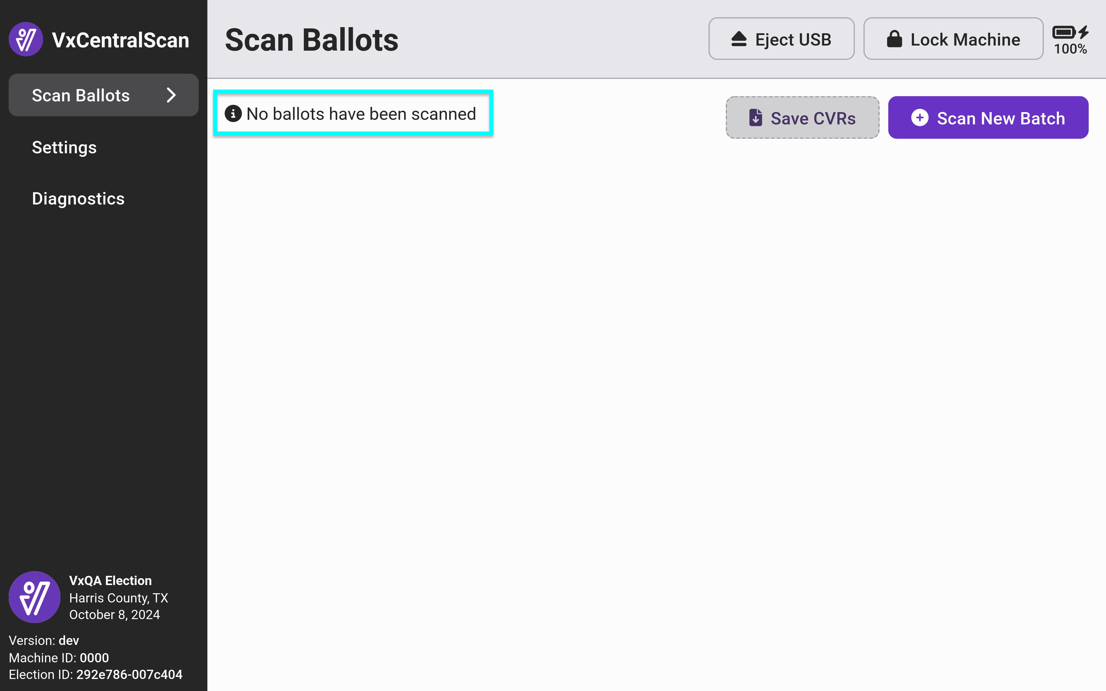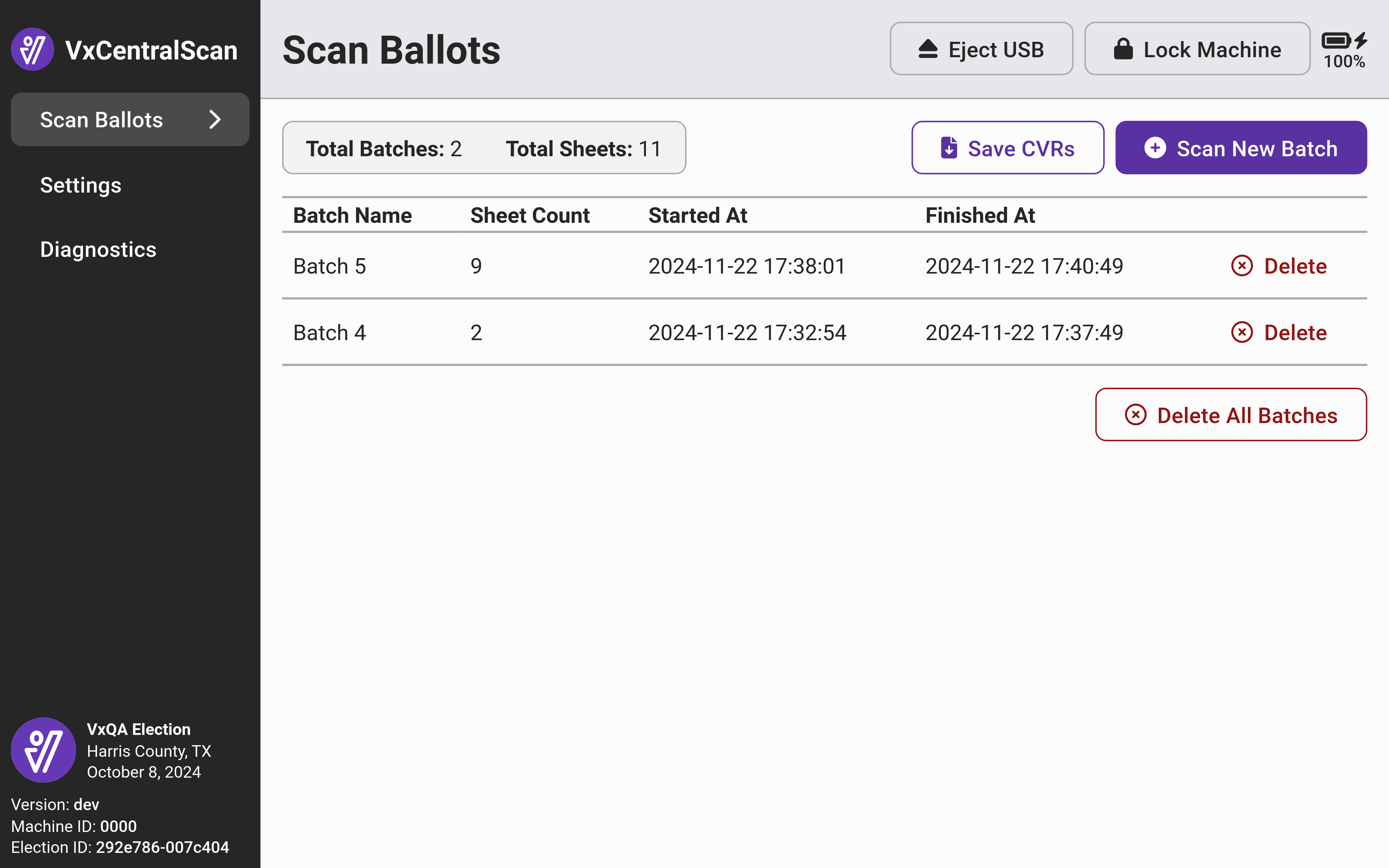 Before scanning the first ballot batch, confirm that VxCentralScan displays *No ballots have been scanned*. If not, select *`Delete All Batches`* to clear the scanned ballot data.