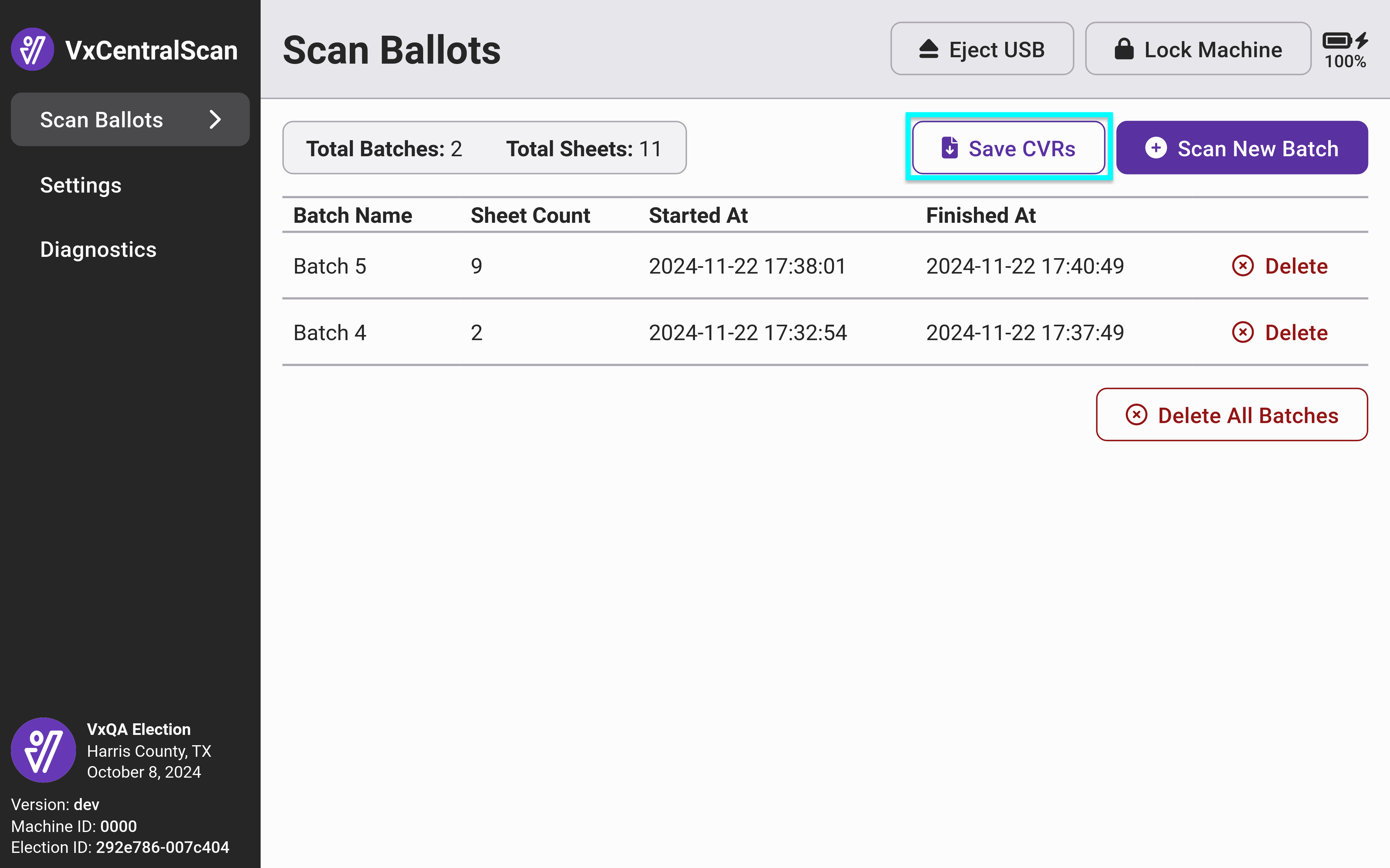 When all ballot batches (including any duplicated ballots) have been scanned, you will need to save the CVRs from VxCentralScan to load into VxAdmin for further adjudication and reporting.