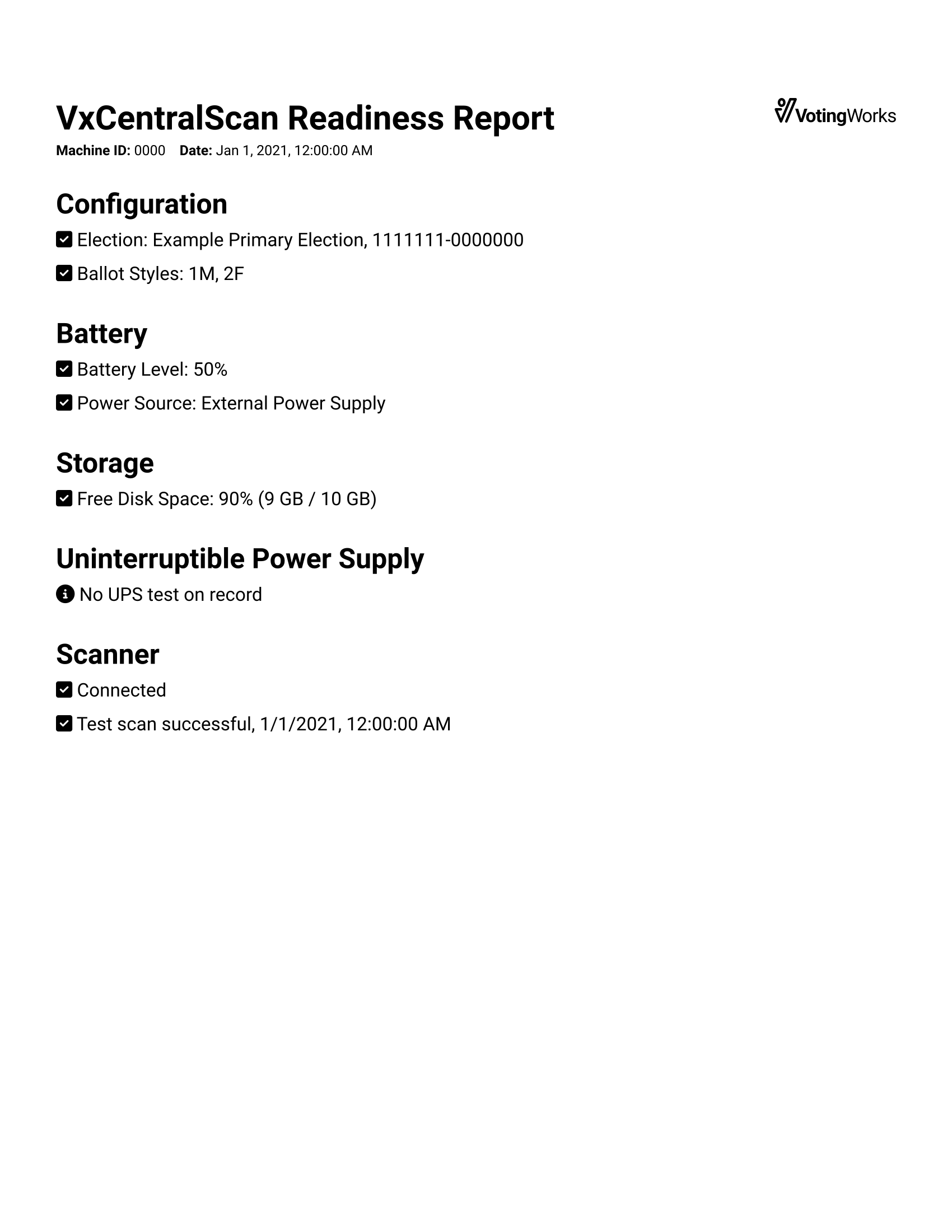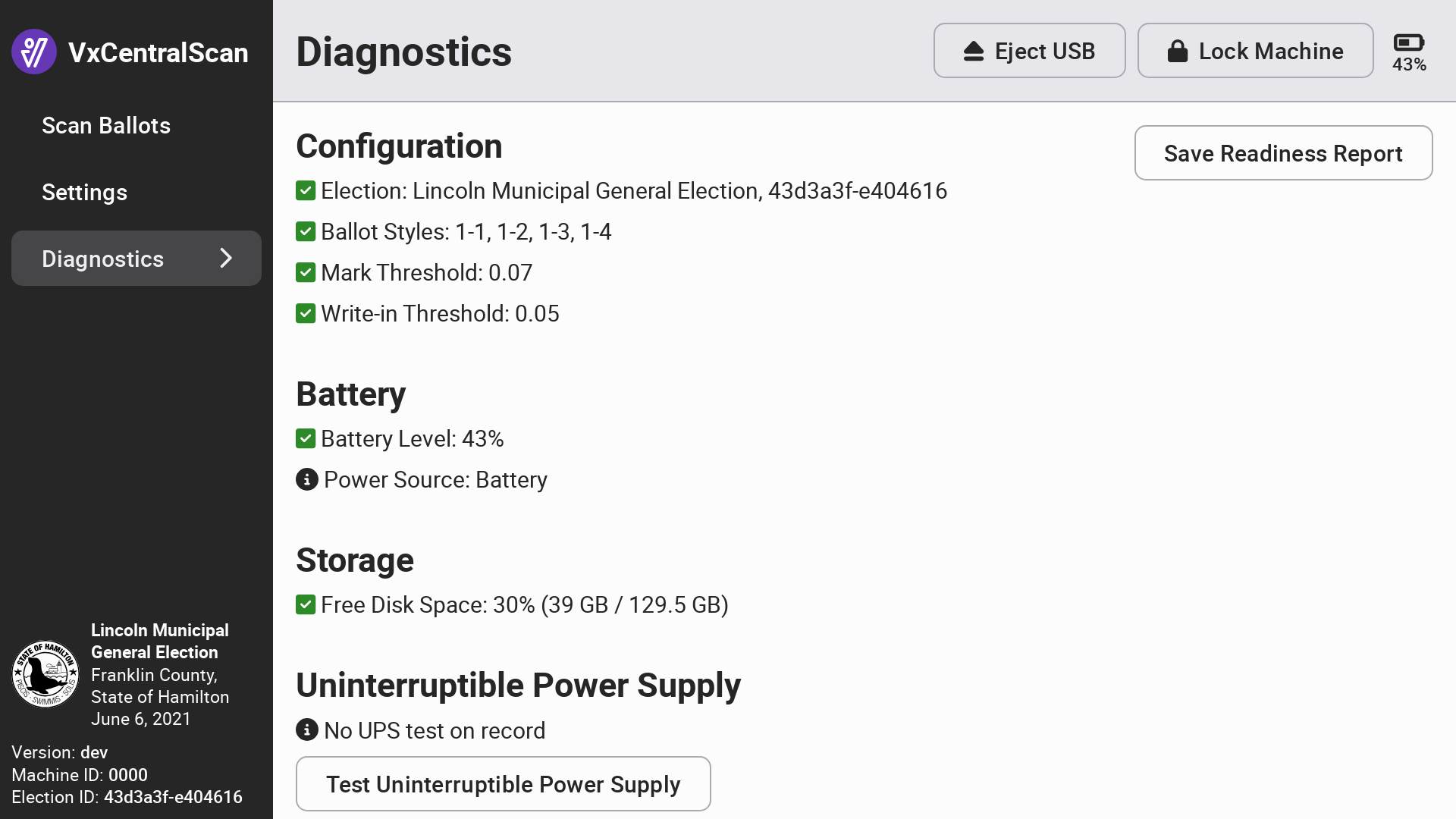 The VxCentralScan diagnostics interface displays information about the currently configured election, if any, the current battery level and charging status, and the disk space available to the application. For large elections, the disk space should be monitored to ensure that you are not exceeding system storage limits. The uninterruptible power supply test asks the user to confirm that the scanner's uninterruptible power supply is connected and fully charged.