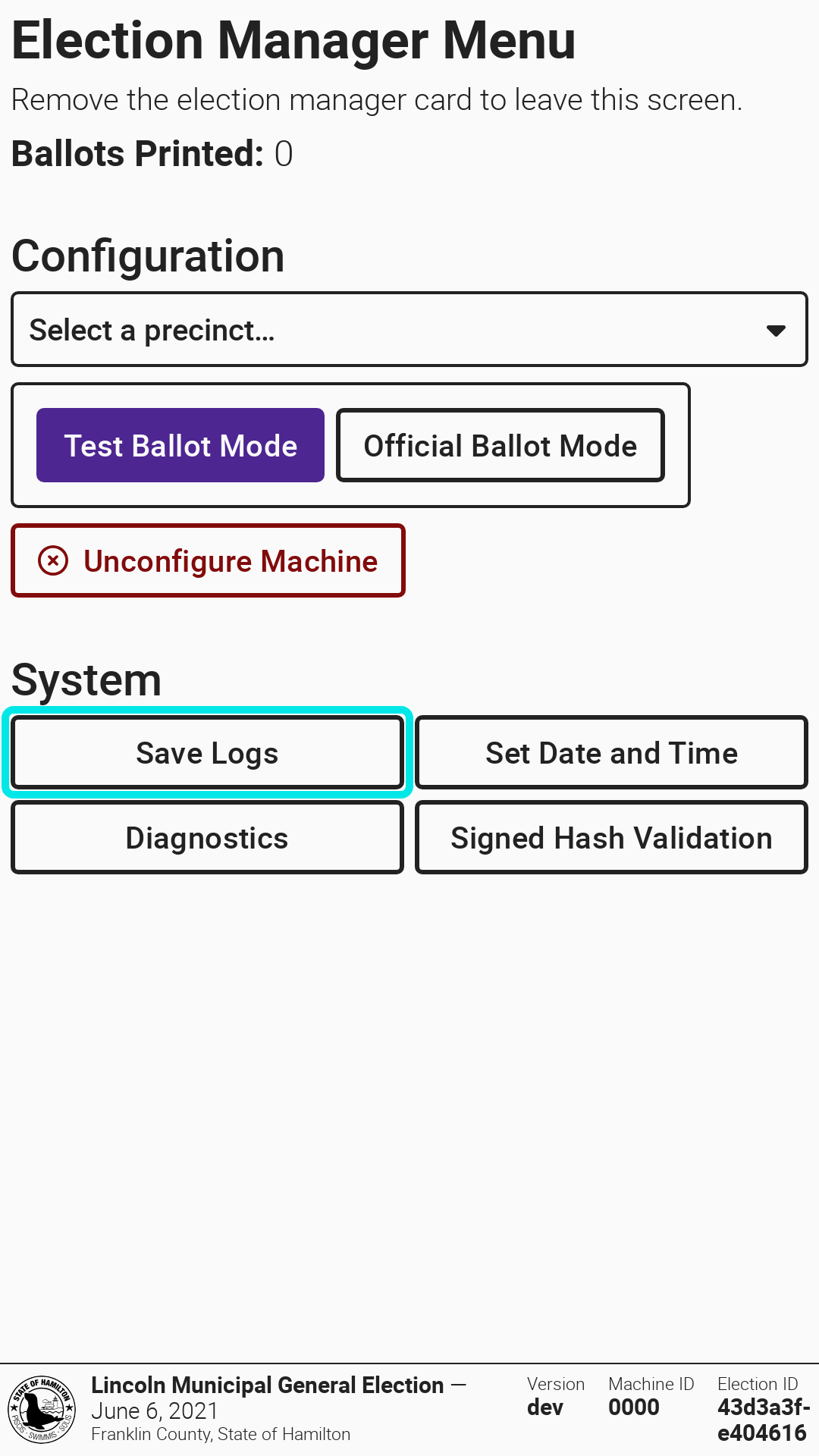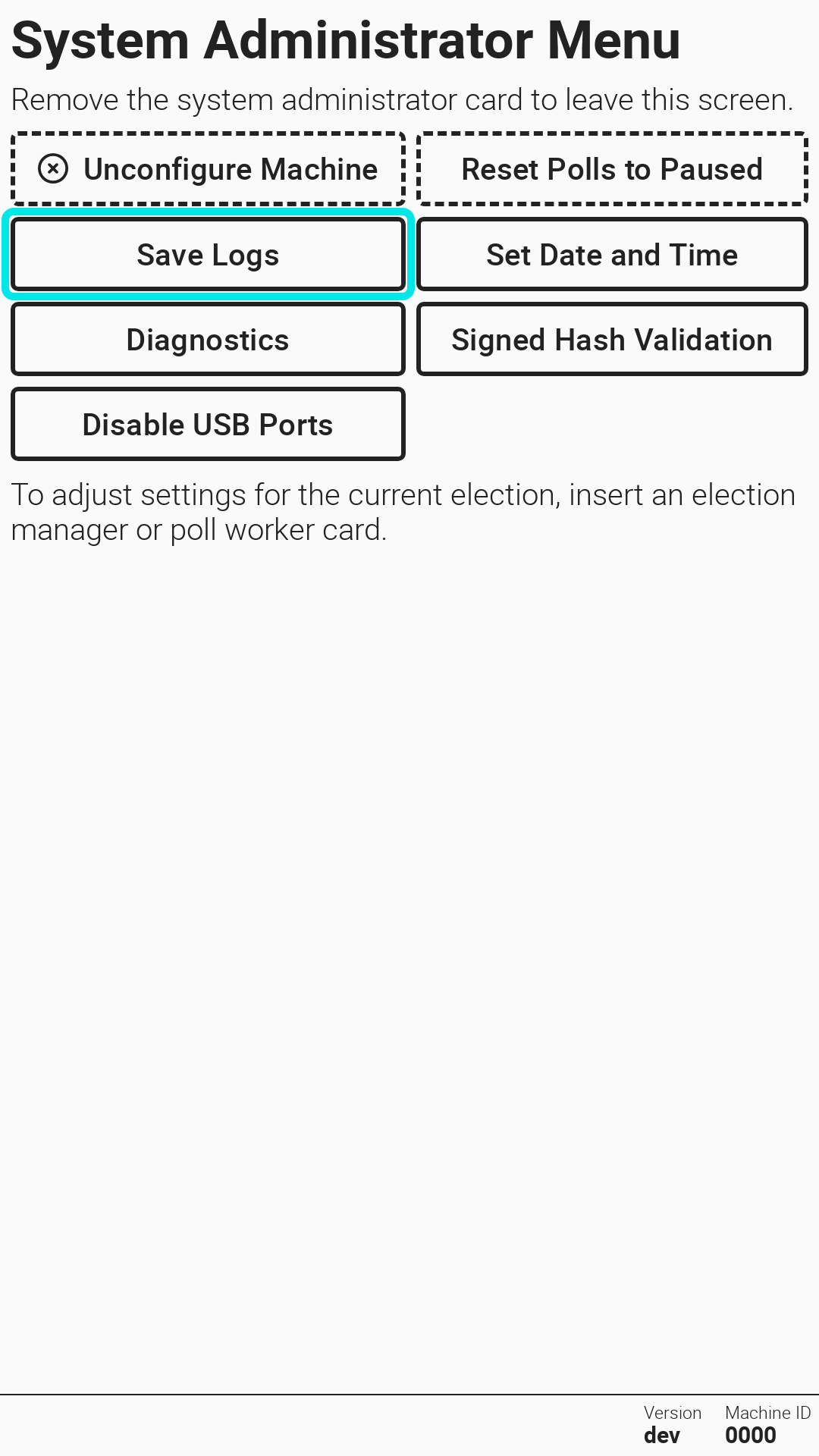 VxMarkScan does not retain any type of ballot or voter data so the only files to retain after an election are the logs. Logs are saved in the /logs folder on the USB drive. To save logs, insert a USB drive, then insert an election manager or system administrator card, and select *`Save Logs`*.