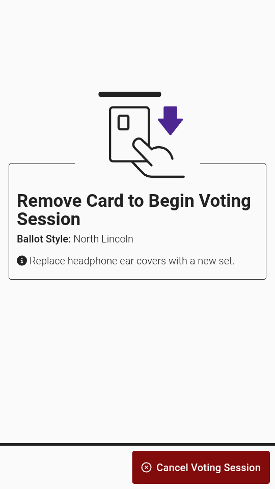 If the wrong ballot style or precinct was selected, insert the poll worker card (if not already inserted) and select *`Cancel Voting Session`* to return to the poll worker menu.