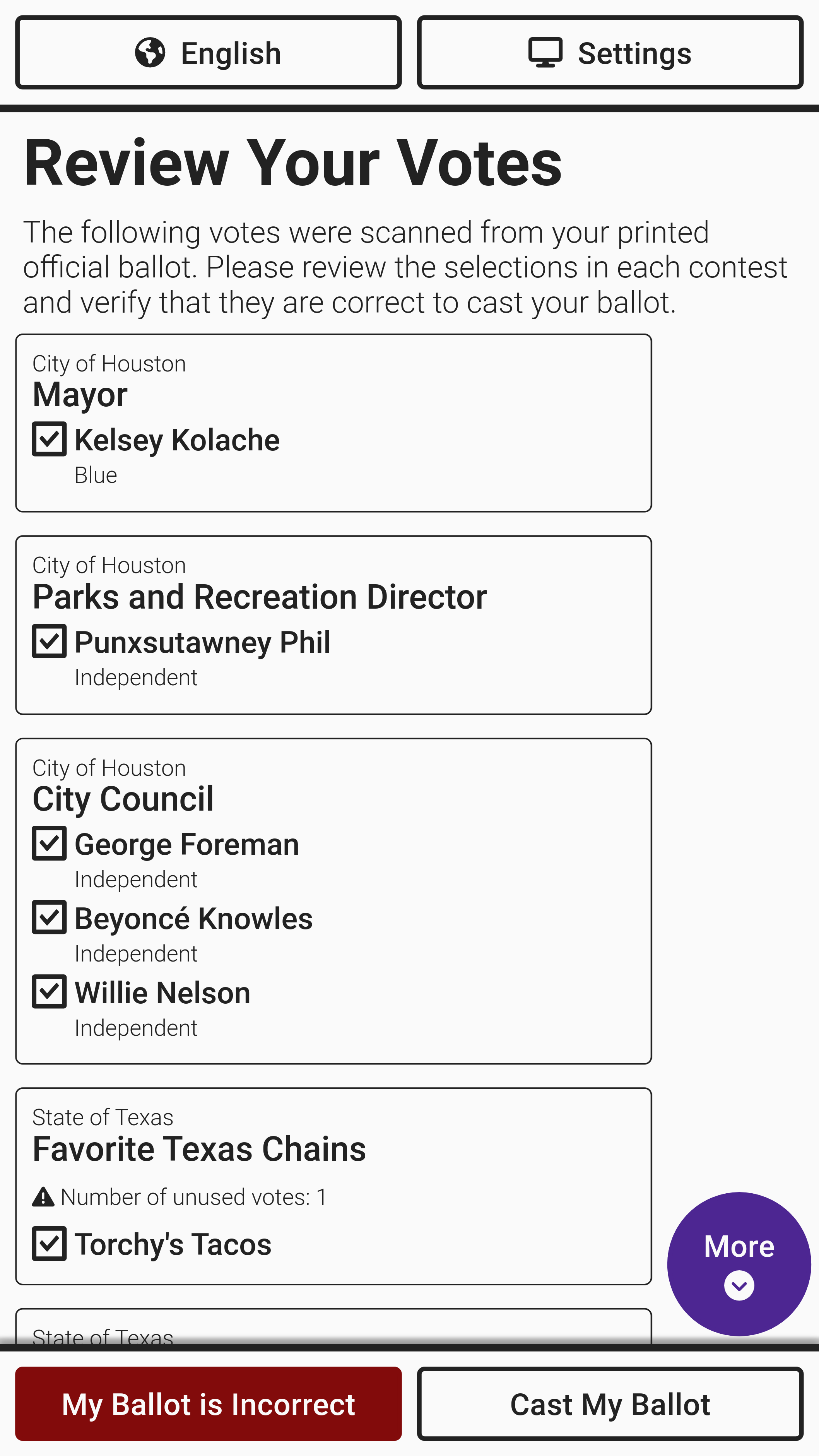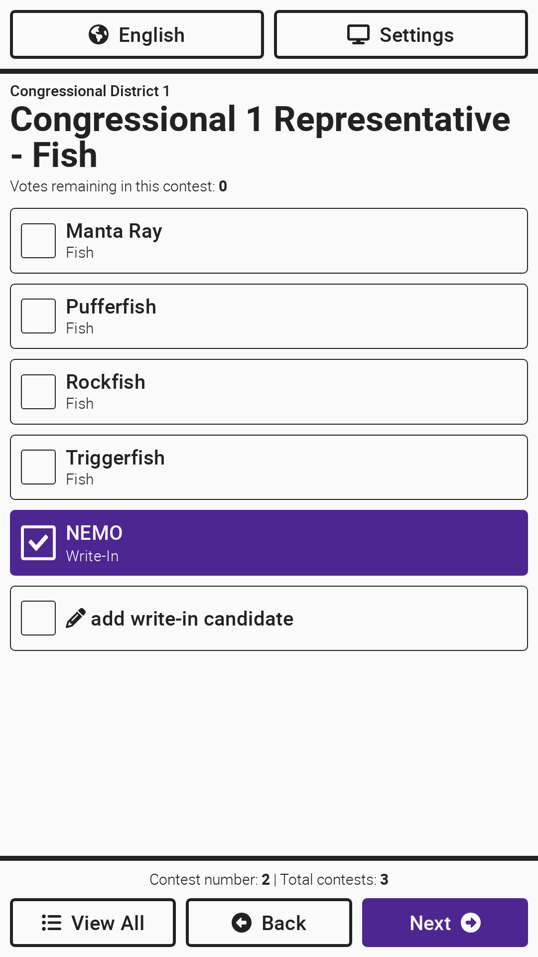One contest will display at a time. The voter will select the candidate(s) of their choice. The voter moves to the next contest by selecting *`Next`*. The voter can skip a contest by selecting *`Next`* without making a selection. To return to a previous contest, select *`Back`*. A *`More`* button will display if there are more candidates or text than fit on a single screen. The *`View All`* button can be used to jump to a review screen summarizing all contest selections, described in greater detail below.