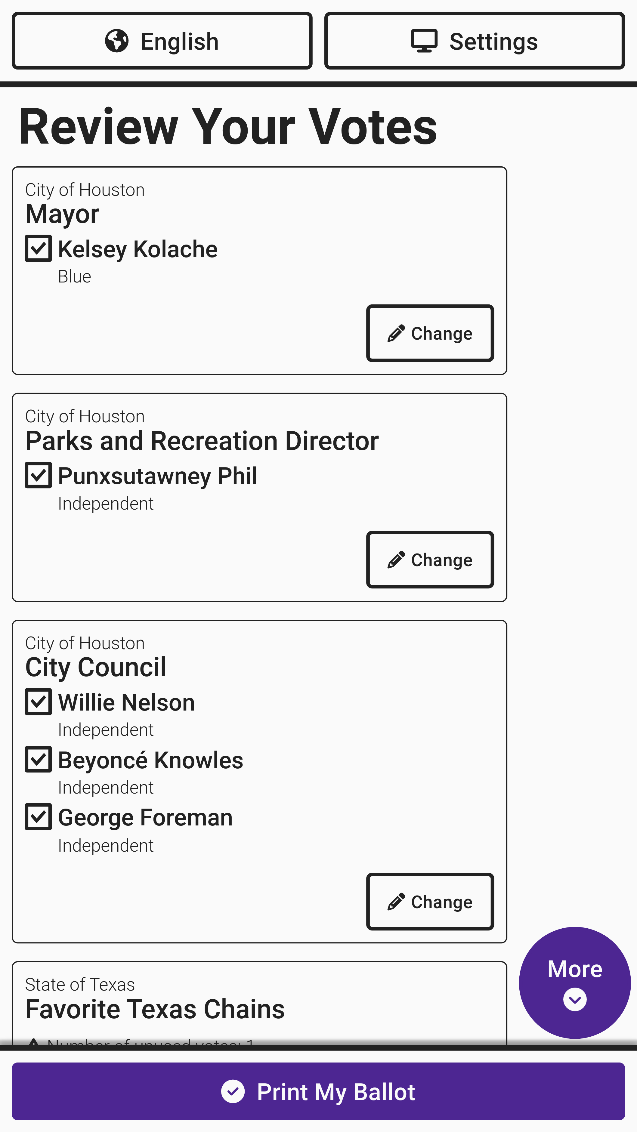 After working through all contests, a *Review Your Votes* screen appears that allows the voter to change any vote by selecting *`Change`*. Once selections have been reviewed, select *`Print My Ballot`*. The ballot will print and be displayed for review.&#x20;
