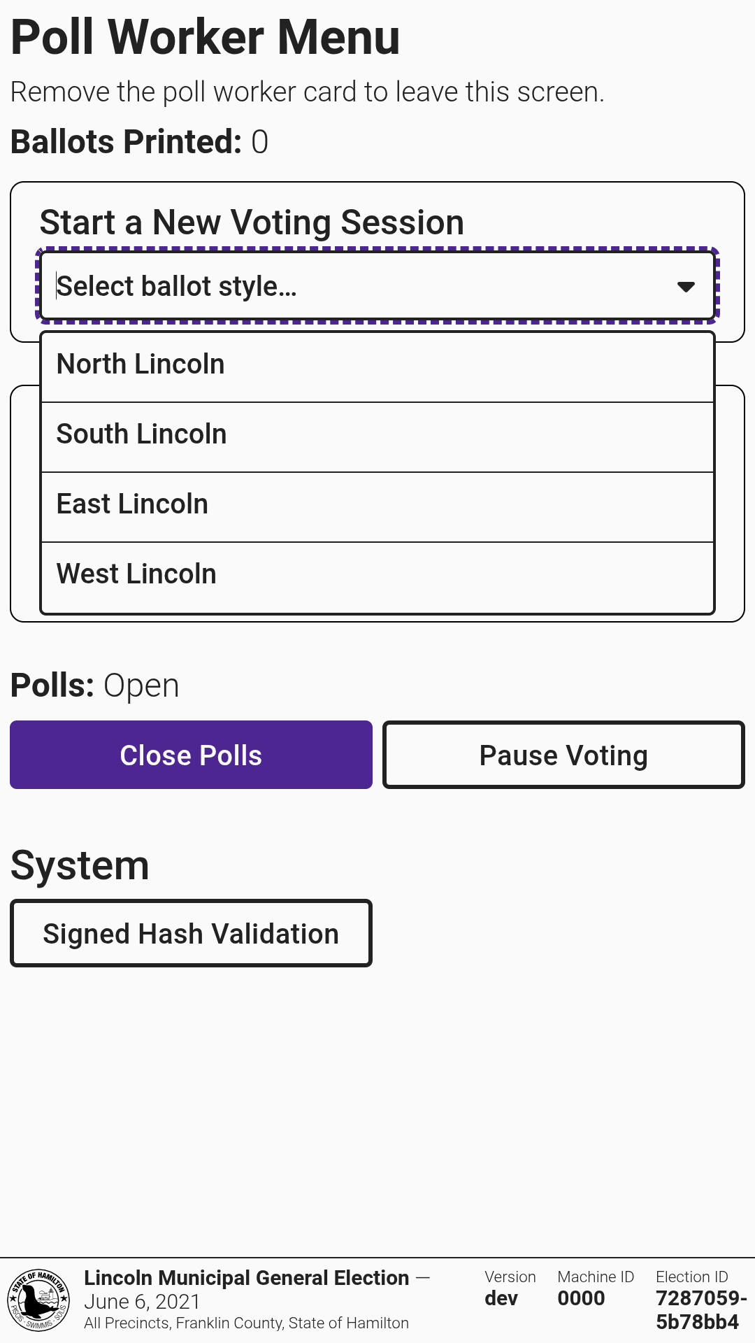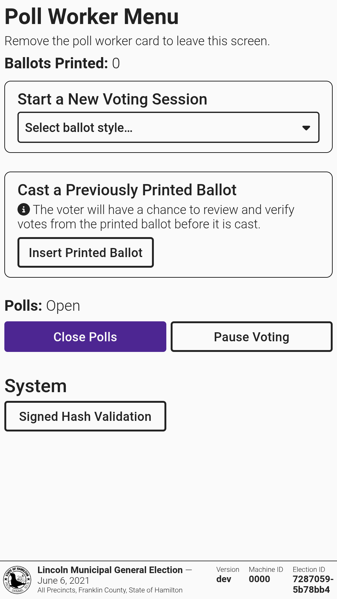 <div><figure><img src="https://2752676040-files.gitbook.io/~/files/v0/b/gitbook-x-prod.appspot.com/o/spaces%2FJtZutzGTdCzsGITrdiph%2Fuploads%2Fgit-blob-3b2a693e814ba6e4ebcb95458c9208aeb679944e%2Fvxmark-poll-worker-insert-card.png?alt=media" alt=""><figcaption></figcaption></figure> <figure><img src="https://2752676040-files.gitbook.io/~/files/v0/b/gitbook-x-prod.appspot.com/o/spaces%2FJtZutzGTdCzsGITrdiph%2Fuploads%2Fgit-blob-e911a986493aed3f9a5fc35c97f7ed639e26a355%2Fvxmark-poll-worker.png?alt=media" alt=""><figcaption></figcaption></figure> <figure><img src="https://2752676040-files.gitbook.io/~/files/v0/b/gitbook-x-prod.appspot.com/o/spaces%2FJtZutzGTdCzsGITrdiph%2Fuploads%2Fgit-blob-b41164bc9af03974429d11f4eed50e5d8efe336c%2Fvxmark-poll-worker-select-ballot-style.png?alt=media" alt=""><figcaption></figcaption></figure></div>