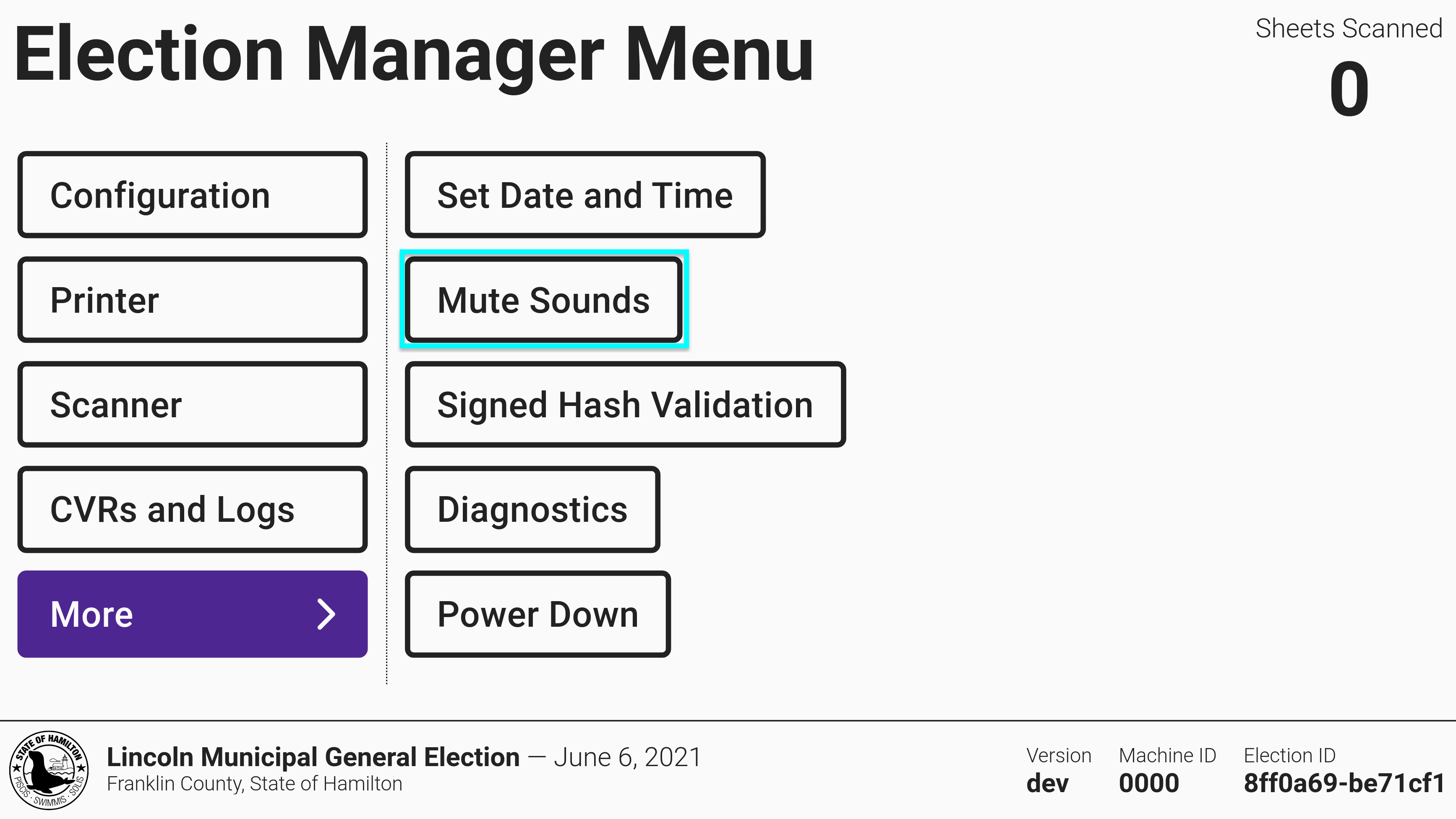 VxScan makes sounds every time a ballot is accepted or rejected. Sounds can be muted and unmuted by an election manager.