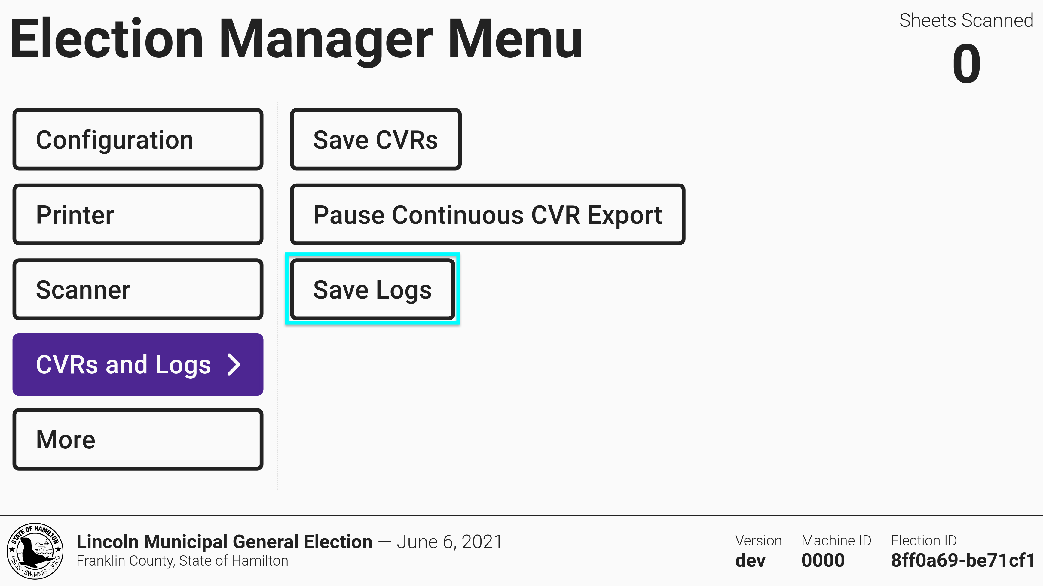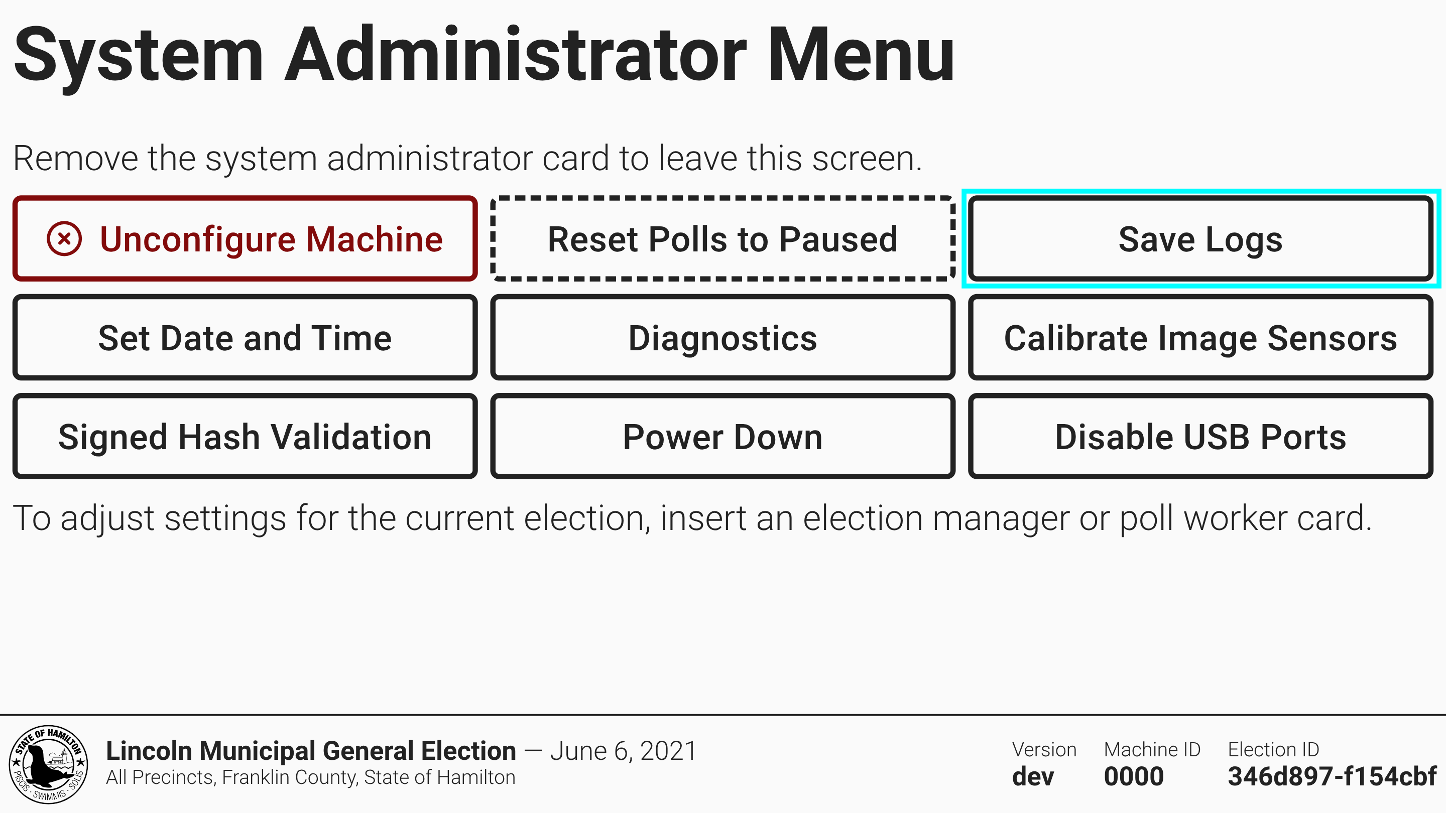The logs contain information about the regular operation of the hardware and software and also any error messages. Both election managers and system administrators can export logs by selecting *`Save Logs`* .