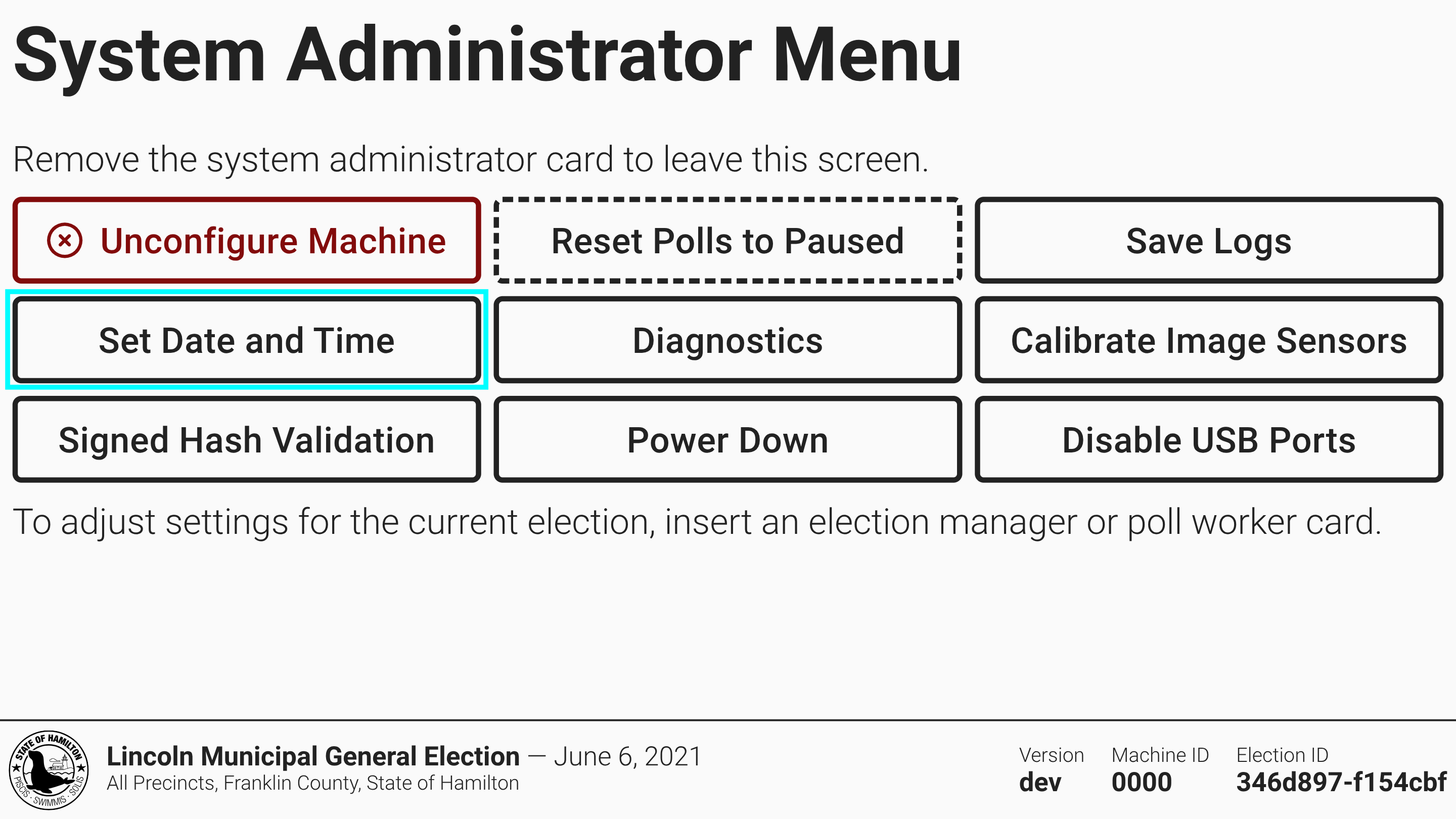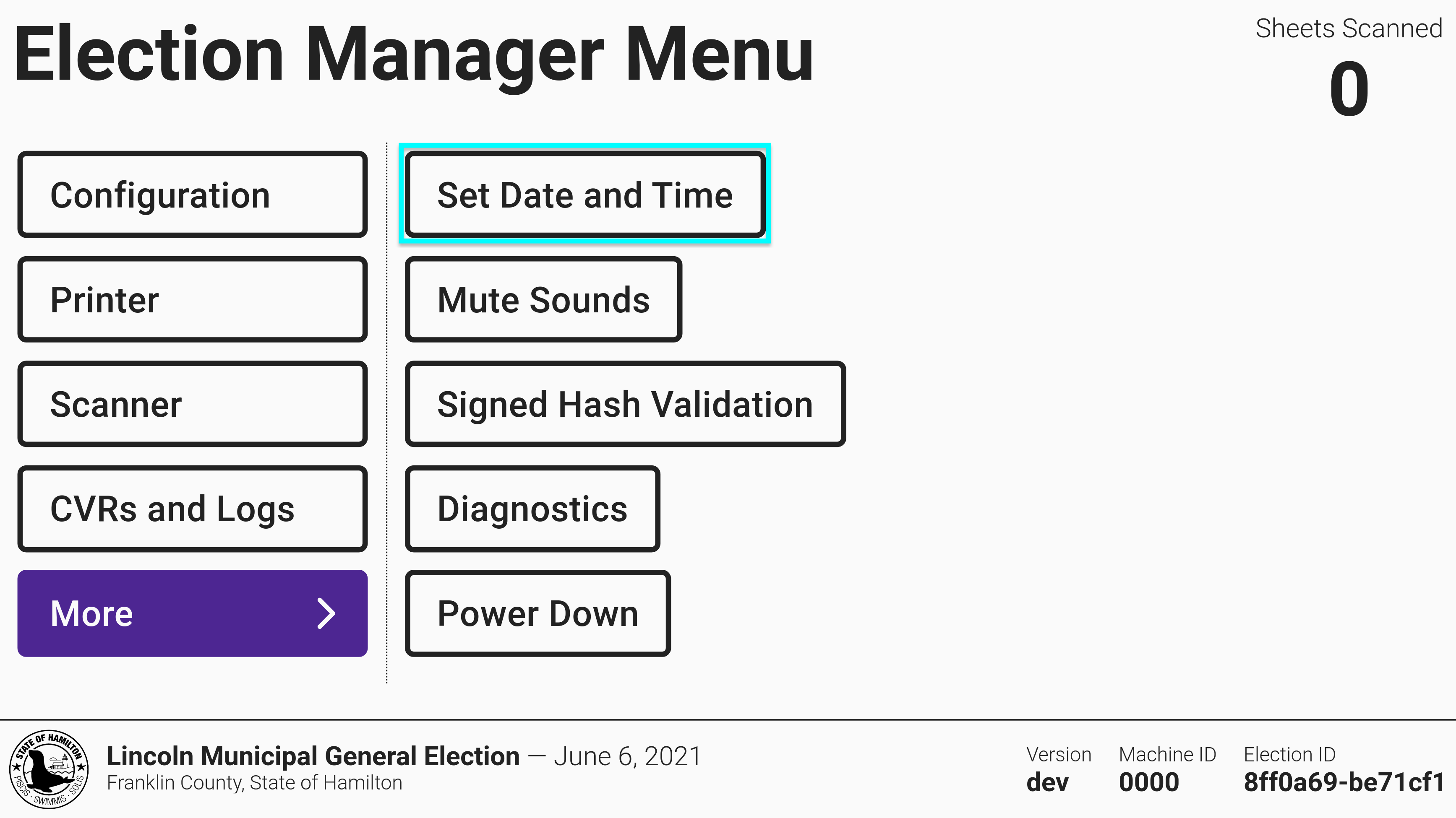 The time on VxScan should stay mostly accurate, including automatically adjusting for daylight savings time, but can drift slightly over time. Both election managers and system administrators can update the time by selecting *`Set Date and Time`*.