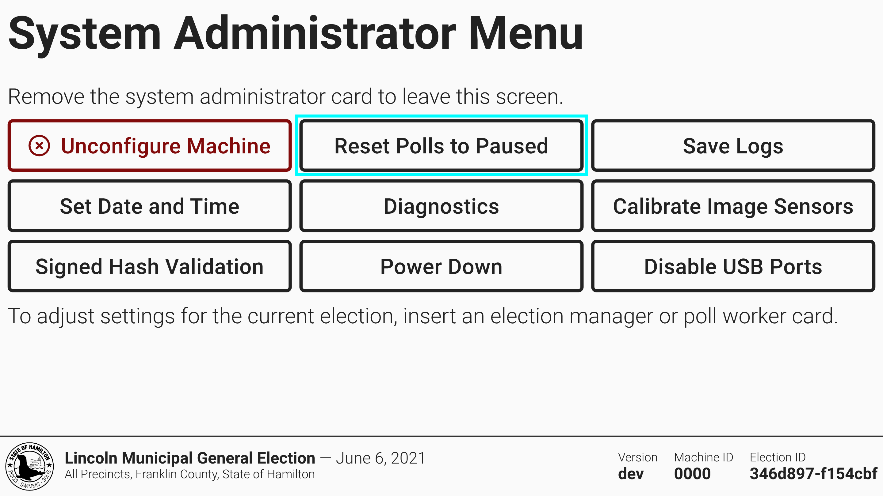If polls have been closed accidentally by a poll worker, a system administrator may reset the polls to paused, after which a poll worker can resume voting.