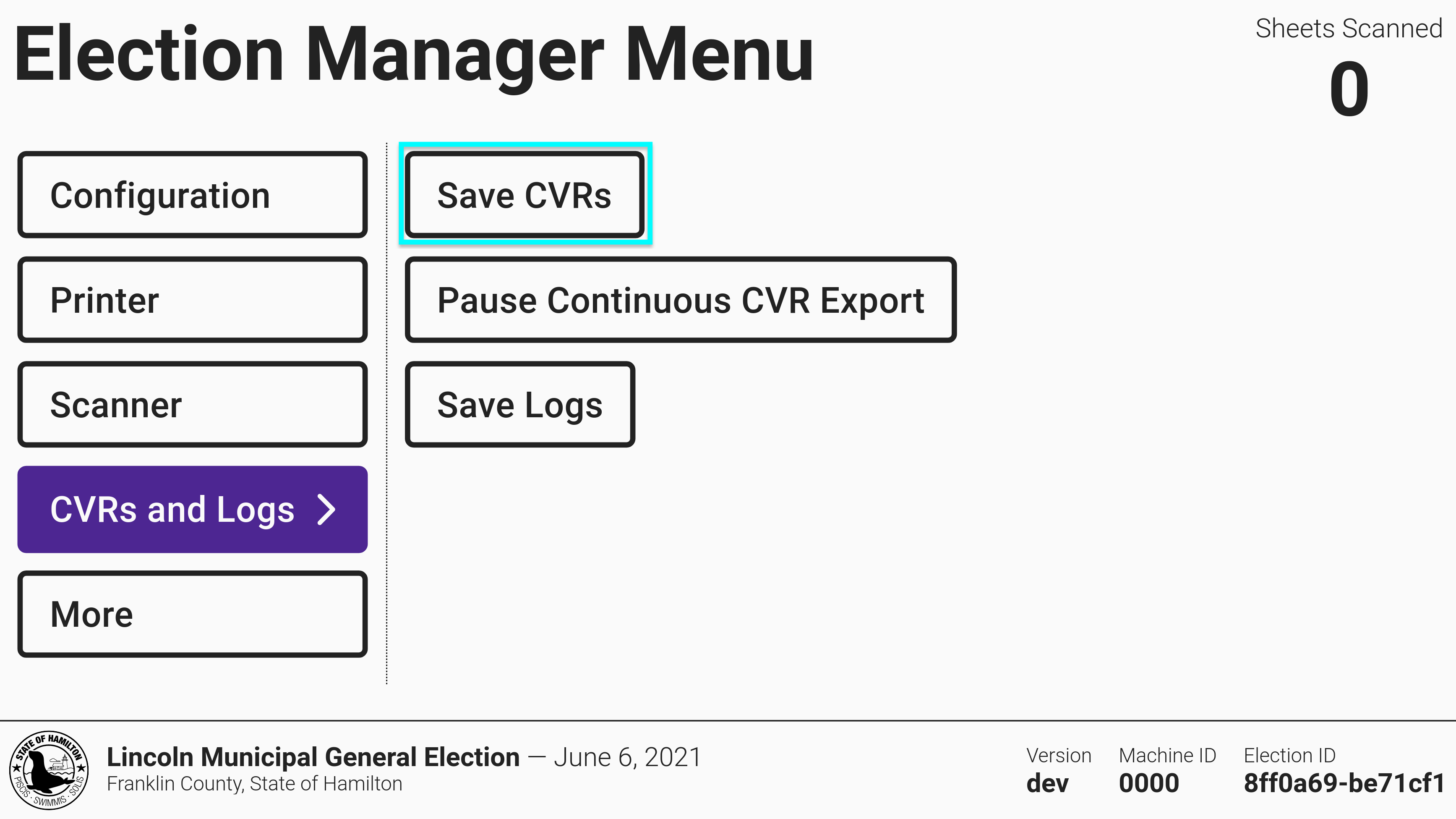 The cast vote records contain the images and the interpretation for each ballot cast and is used to tally votes in VxAdmin. The cast vote record saves continuously to the USB drive throughout the day and again at the close of polls. If another copy is needed, however, it can also be saved by selecting *`CVRs and Logs`* from the side menu and selecting *`Save CVRs`*.
