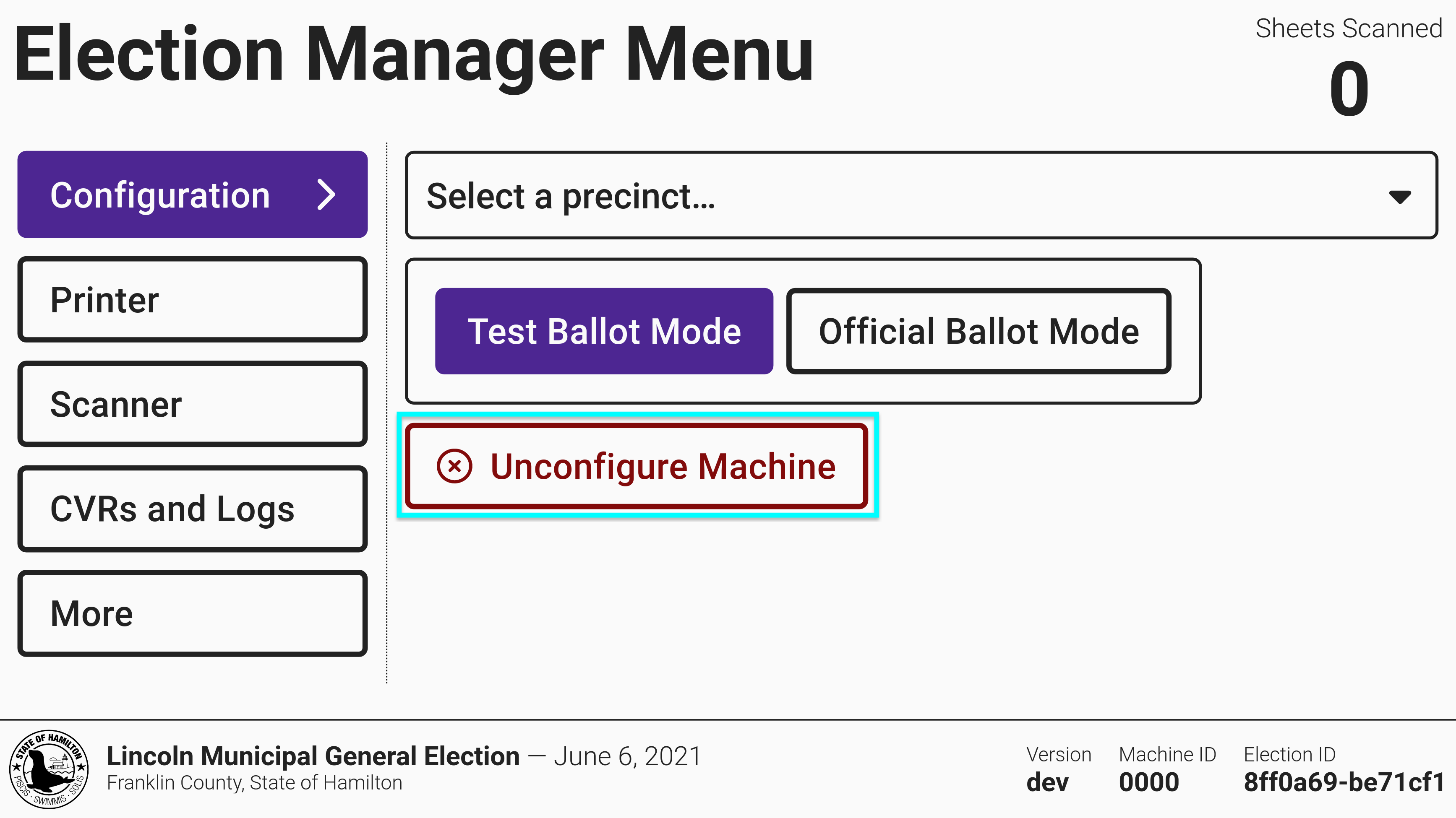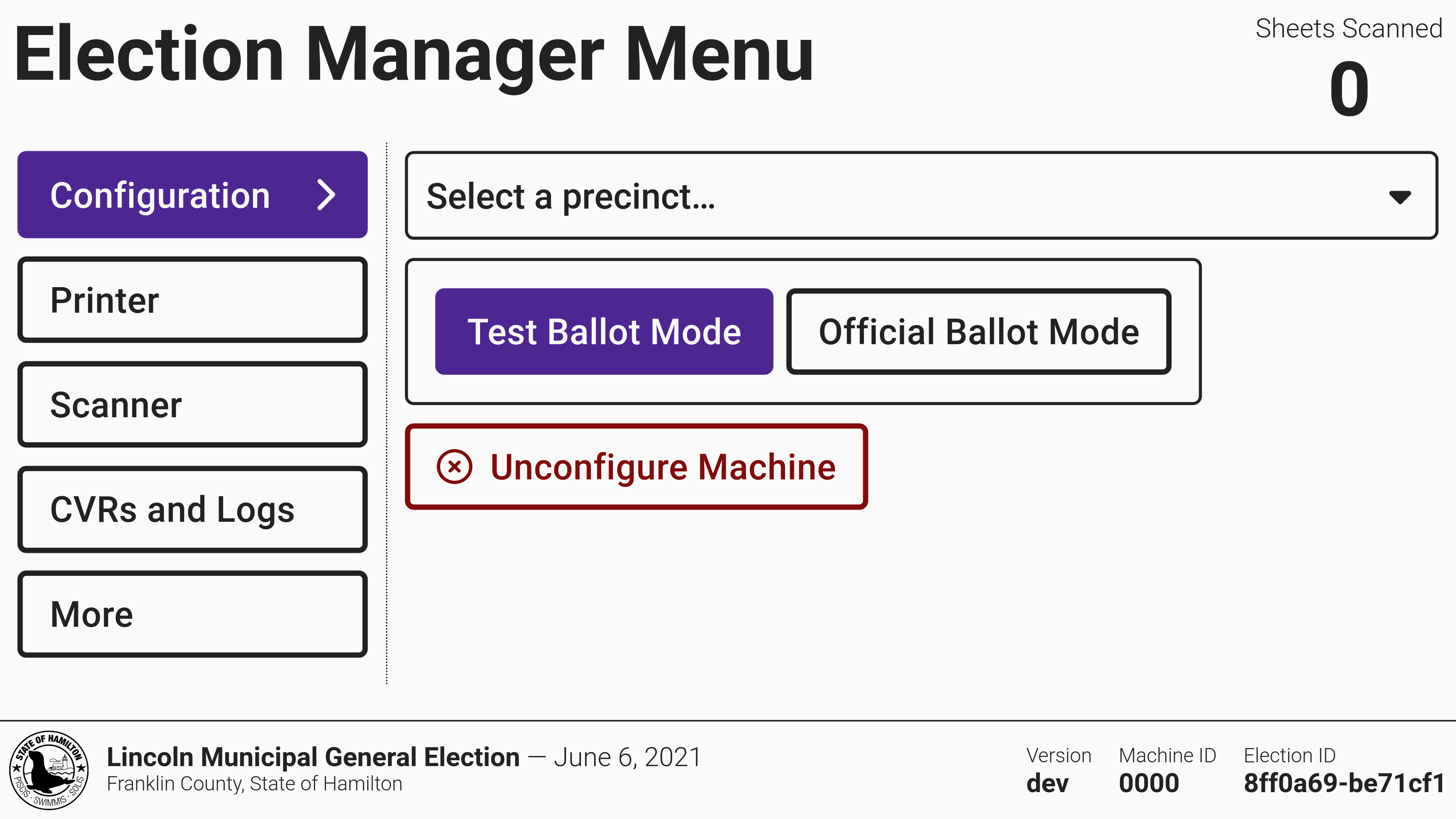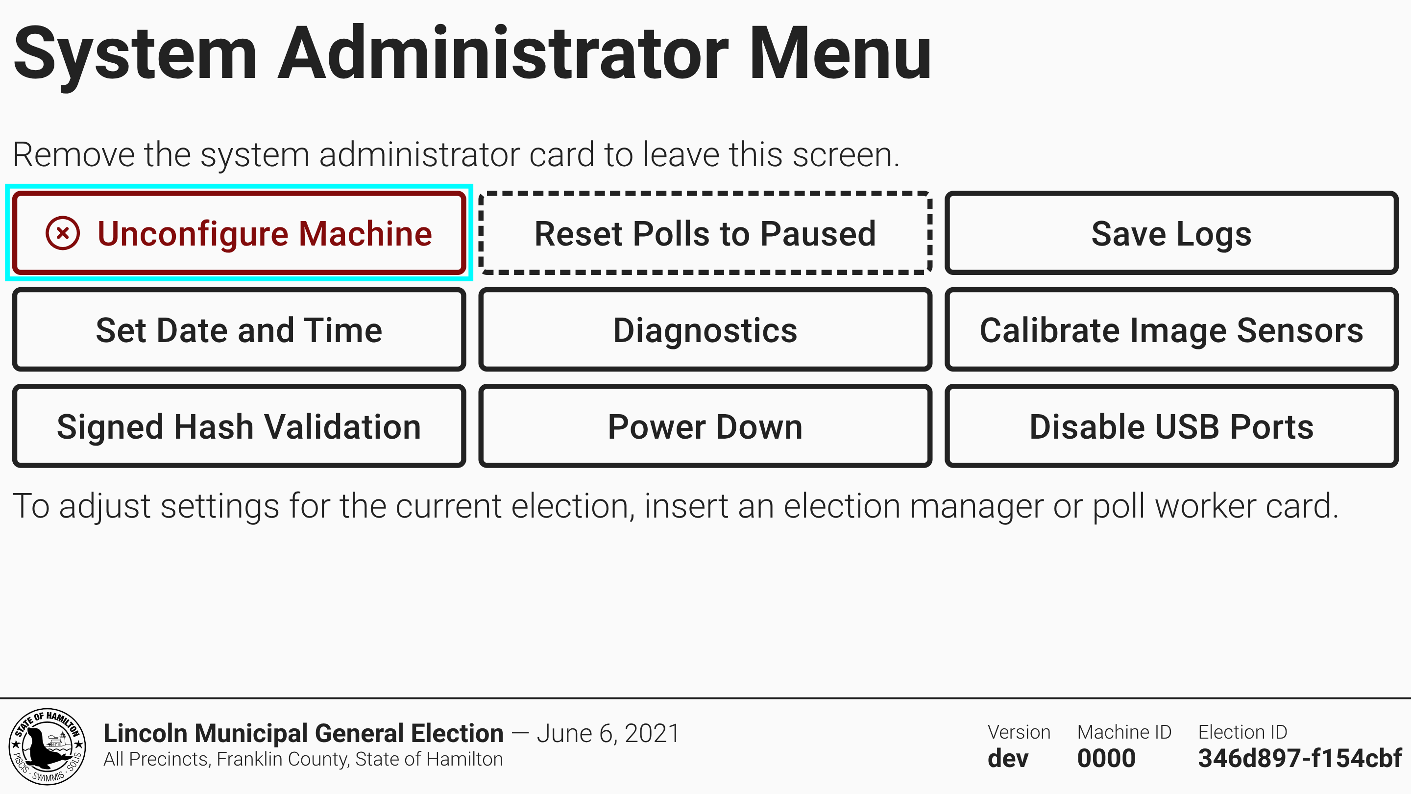 An unconfigured machine will prompt you to insert an election manager card to log in and then insert a USB drive with the election package saved from VxAdmin.