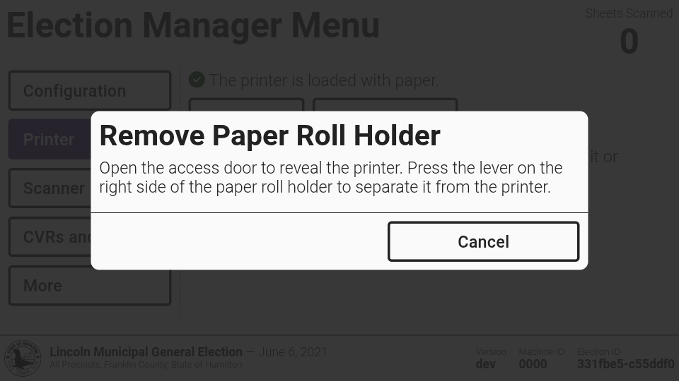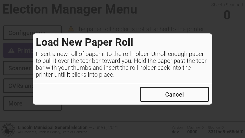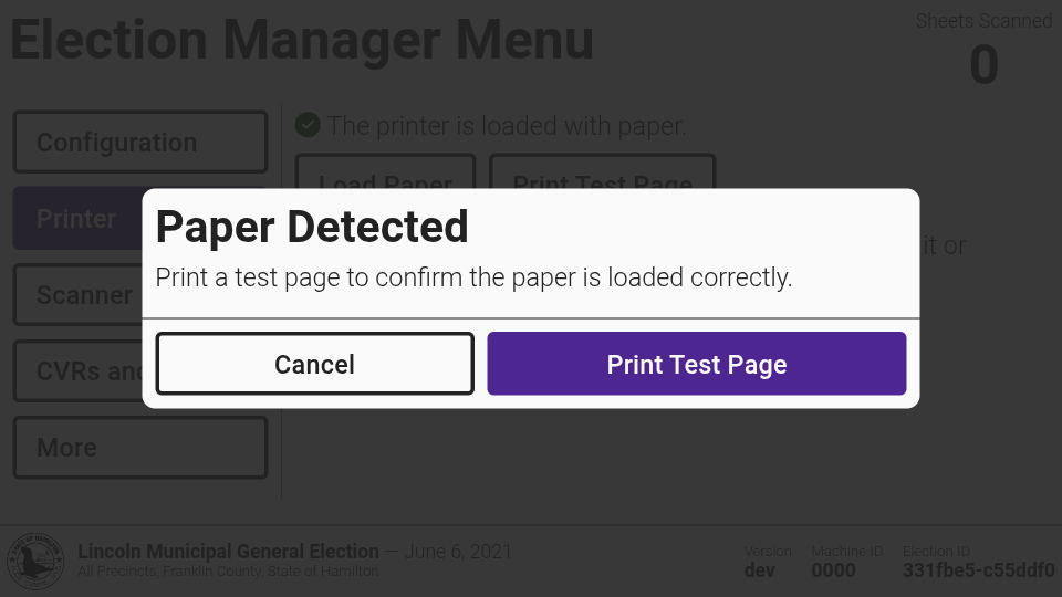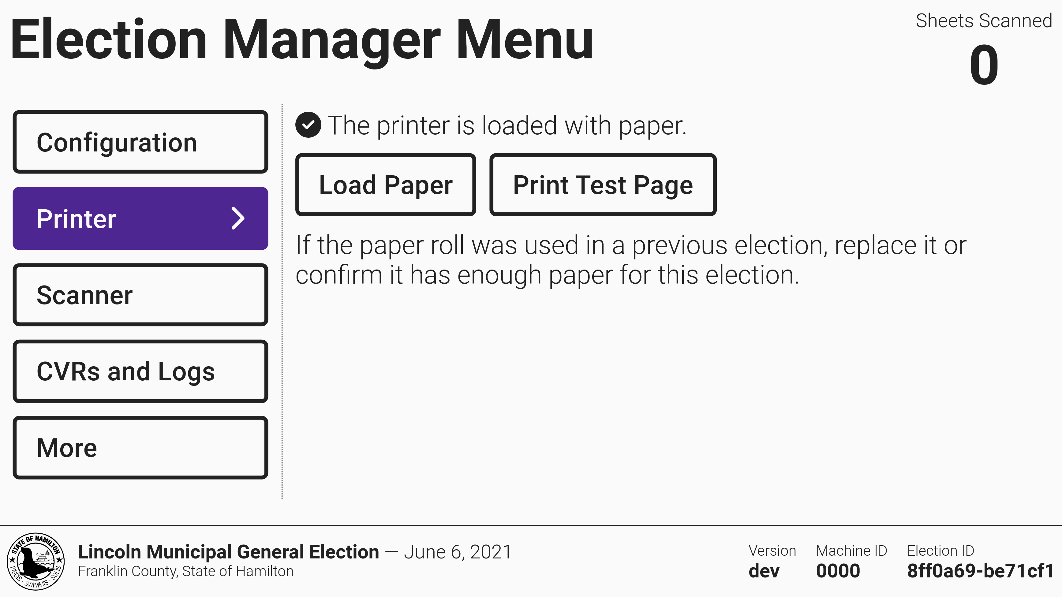 To replace a paper roll or print a test page, navigate to the *`Printer`* tab in the election manager menu and select *`Load Paper`* or *`Print Test Page`*.