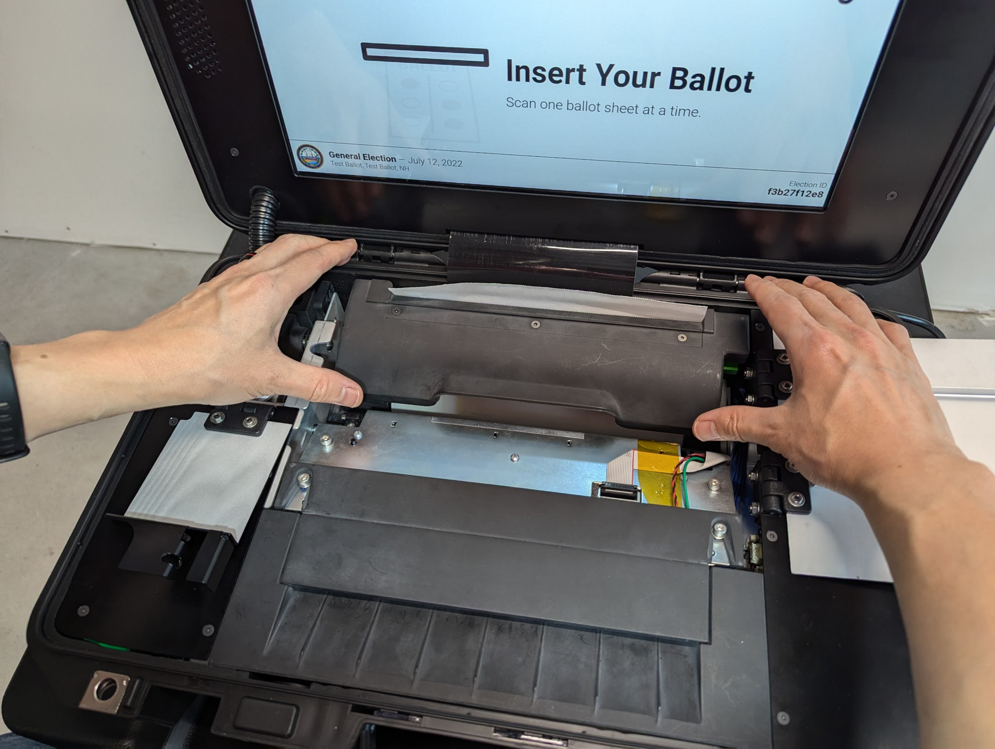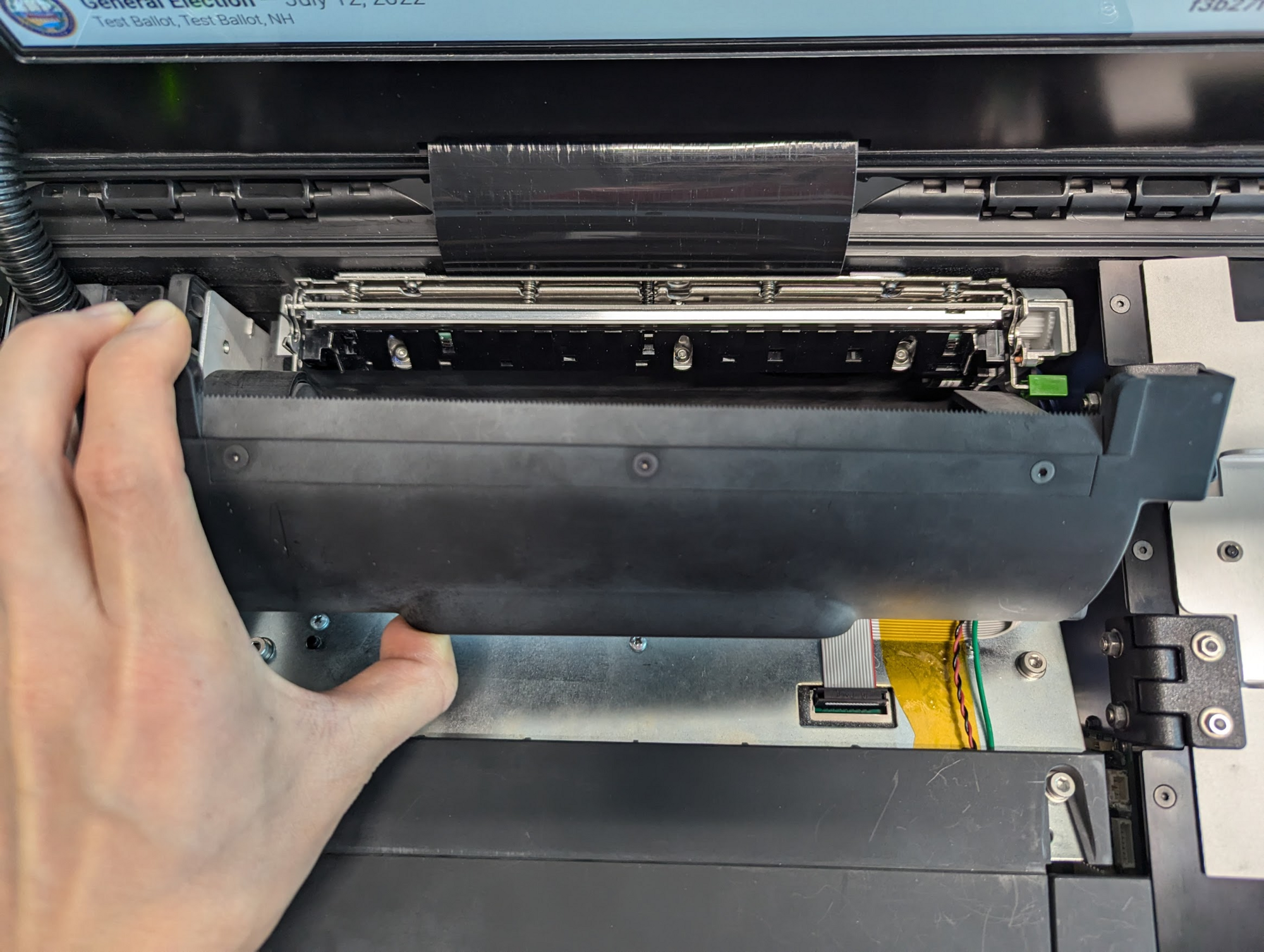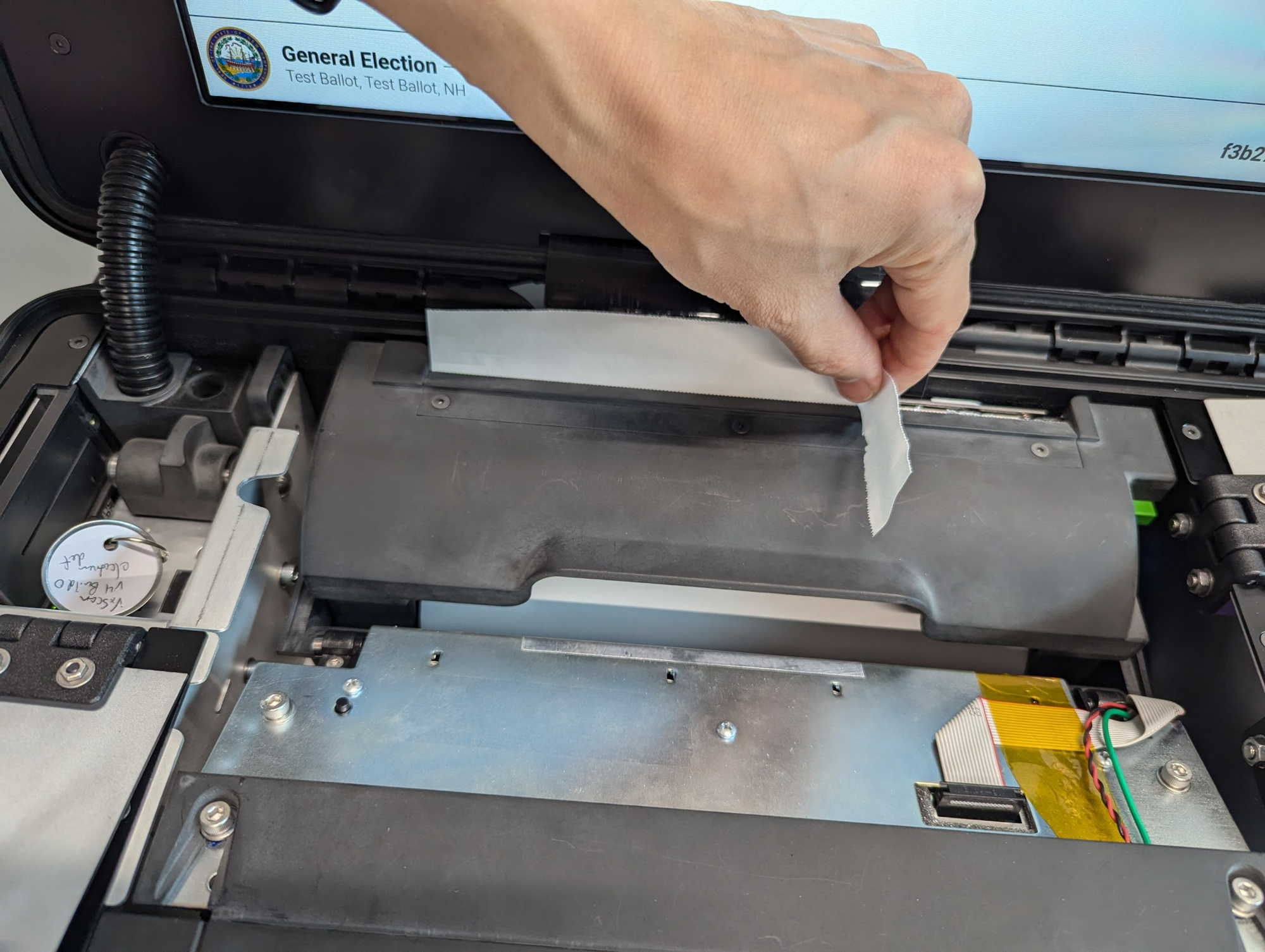 The paper roll can be replaced at any point of time, with the machine turned on or off. Using the election manager printer flow is not required but can be helpful for someone who needs step-by-step instructions or wants to print a test page.