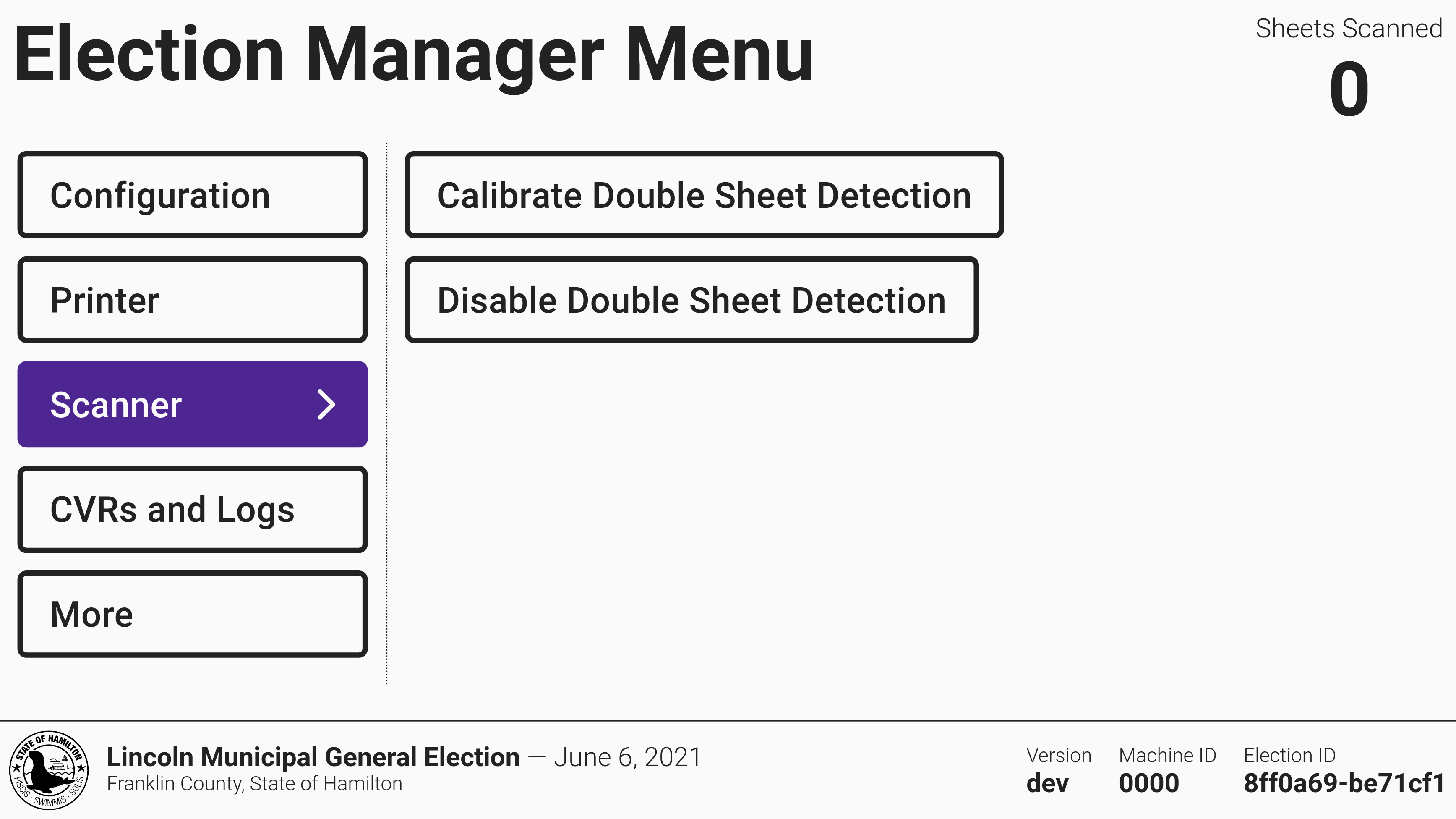 In order to prevent voters attempting to scan two ballots at once, VxScan has a double sheet detection feature. To manage double sheet detection, navigate to the *`Scanner`* tab of the election manager menu.