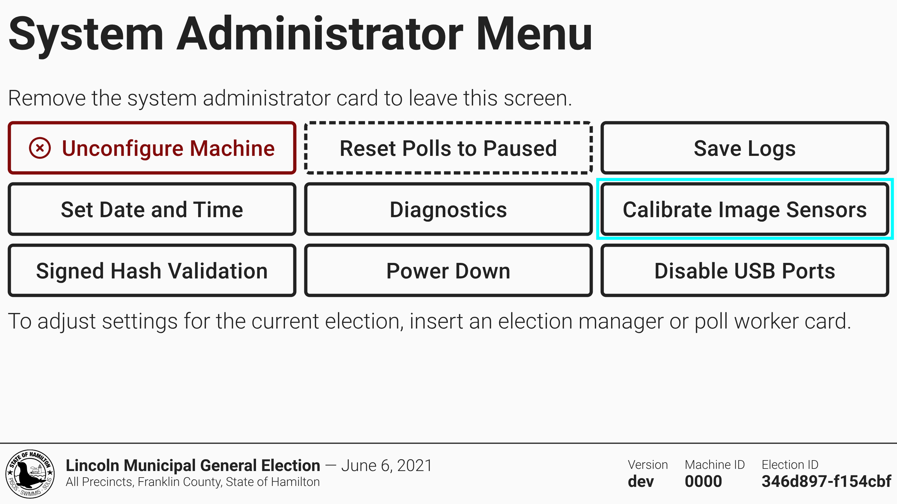Machines are shipped with this calibration having already been completed by the part manufacturer, and it may never have to be performed outside the regular long-term maintenance. It should only be performed during L\&A if ballots *consistently* fail to scan with generic errors unrelated to election configuration (e.g., "Ballot Scan Failed - There was a problem scanning your ballot. Please scan it again."), all other reasons for failure (e.g., ballots not printed to spec) have been ruled out, and VotingWorks support has suggested this as a course of action.