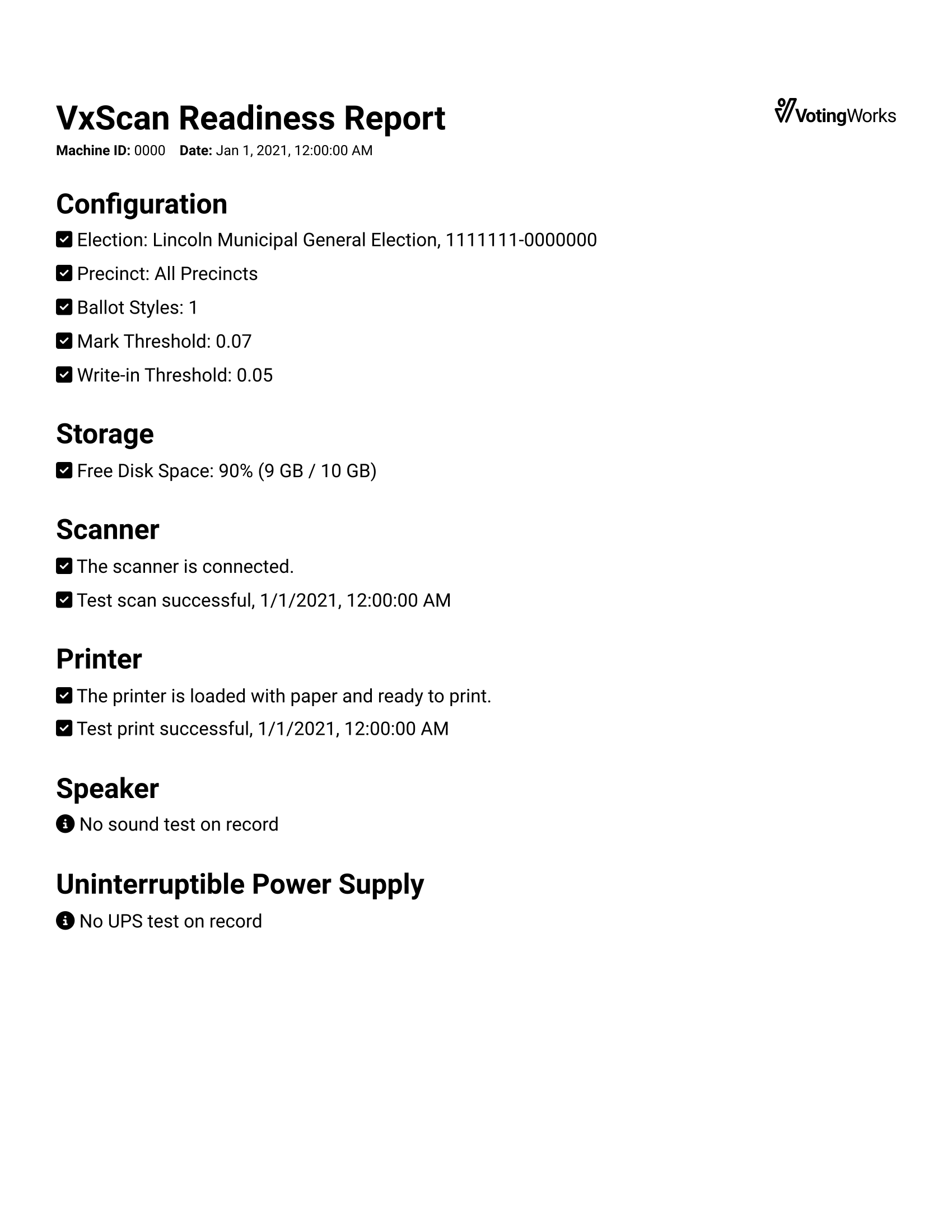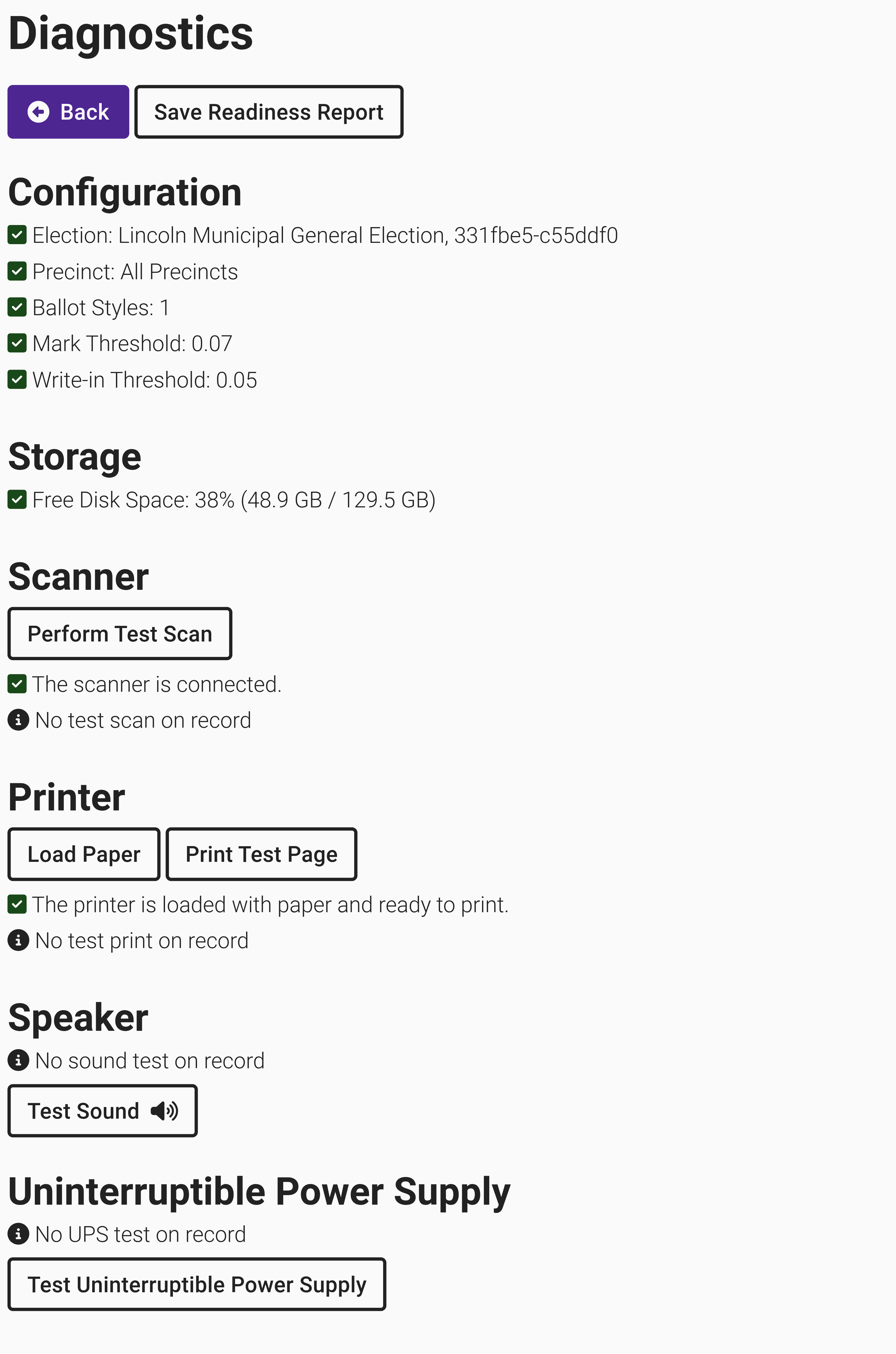 The VxScan diagnostics screen shows information about how the machine is configured, how much storage is left on the device, and the current status of the scanner and printer. Prior to each election, walk through each test to verify each component is in working order. During normal operations, if one of the components fails, VxScan will display an error message on screen.