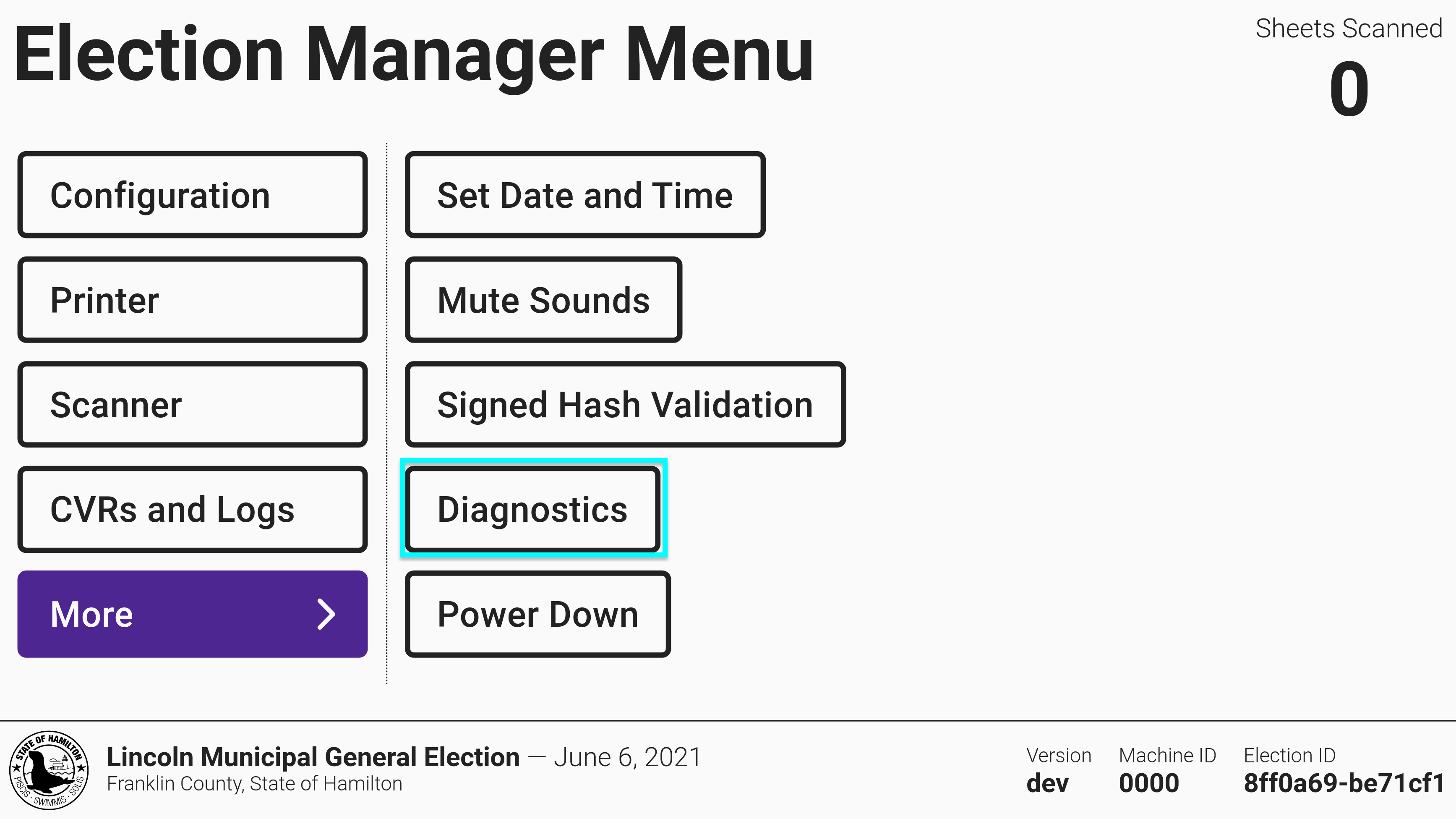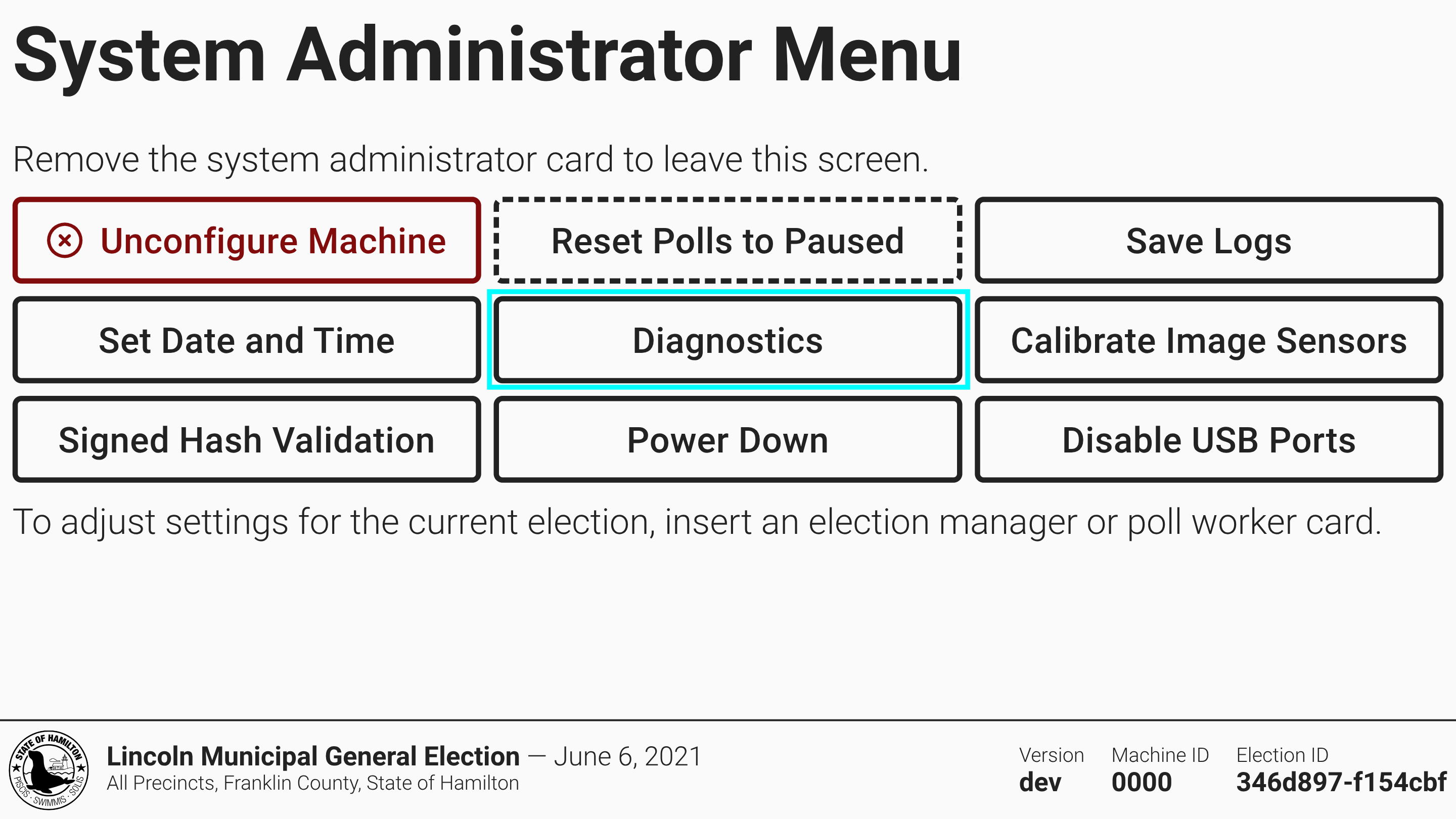 The diagnostics interface is used to test hardware before or between elections and monitor the status of the machine. It is accessible from both the election manager and system administrator menus.
